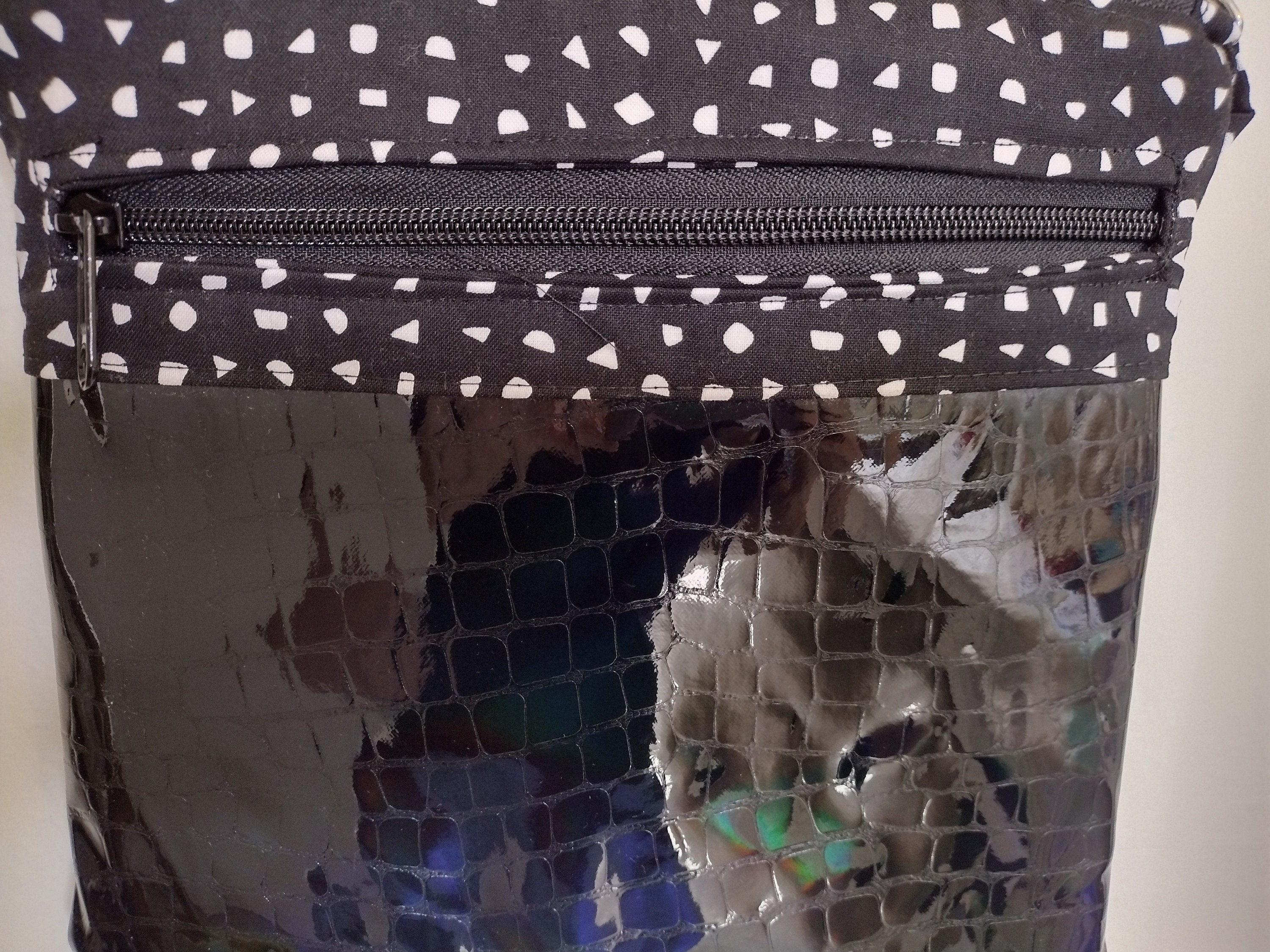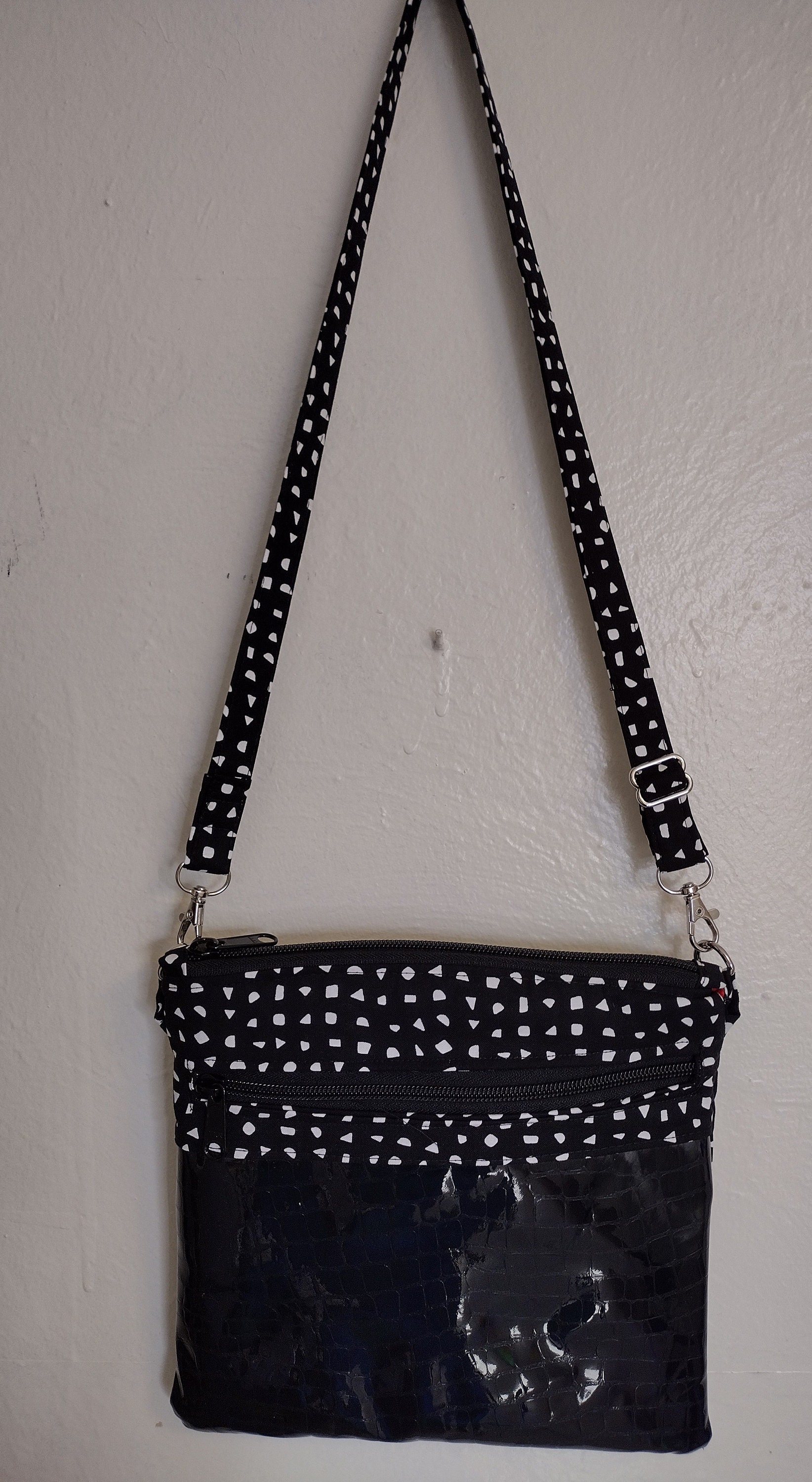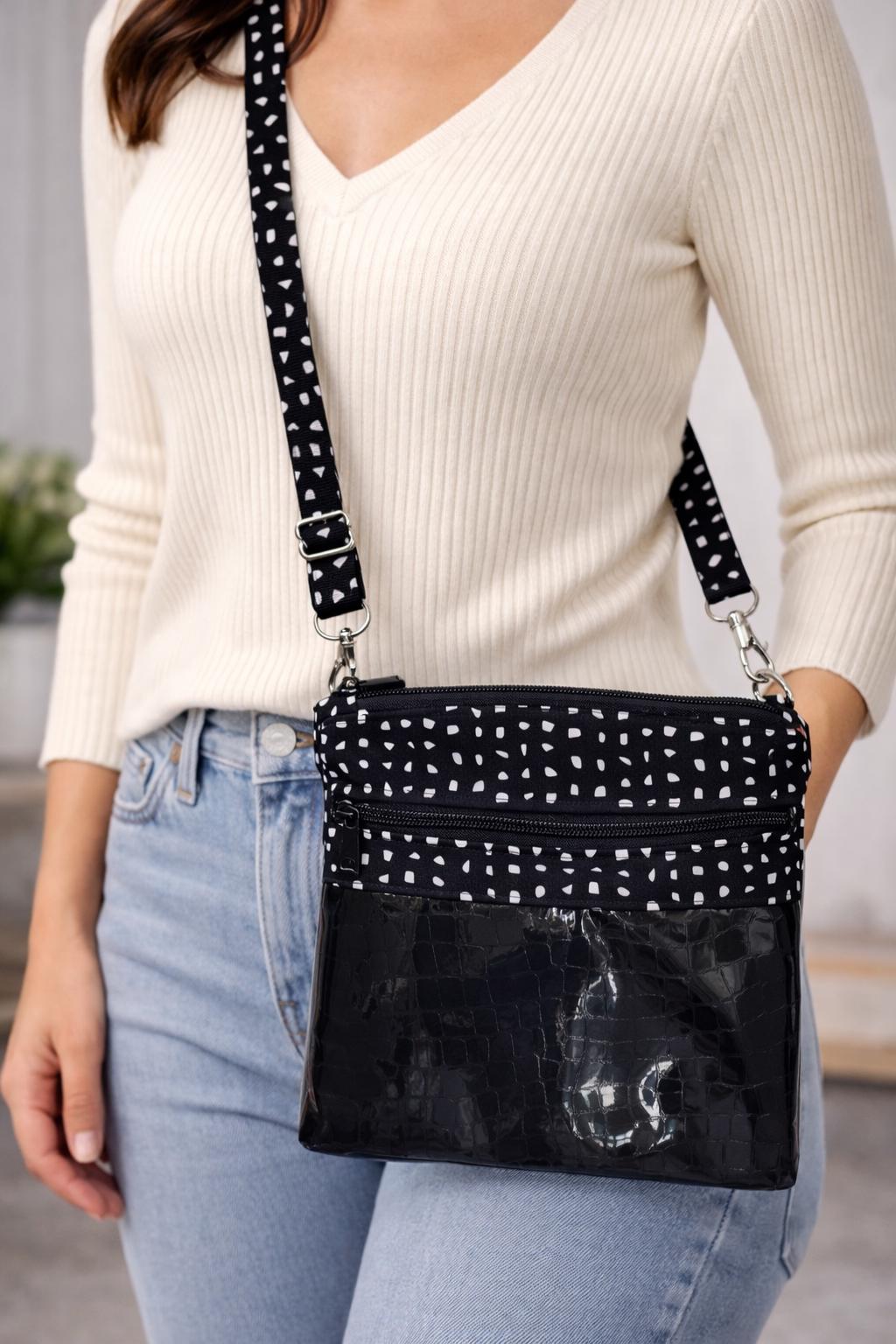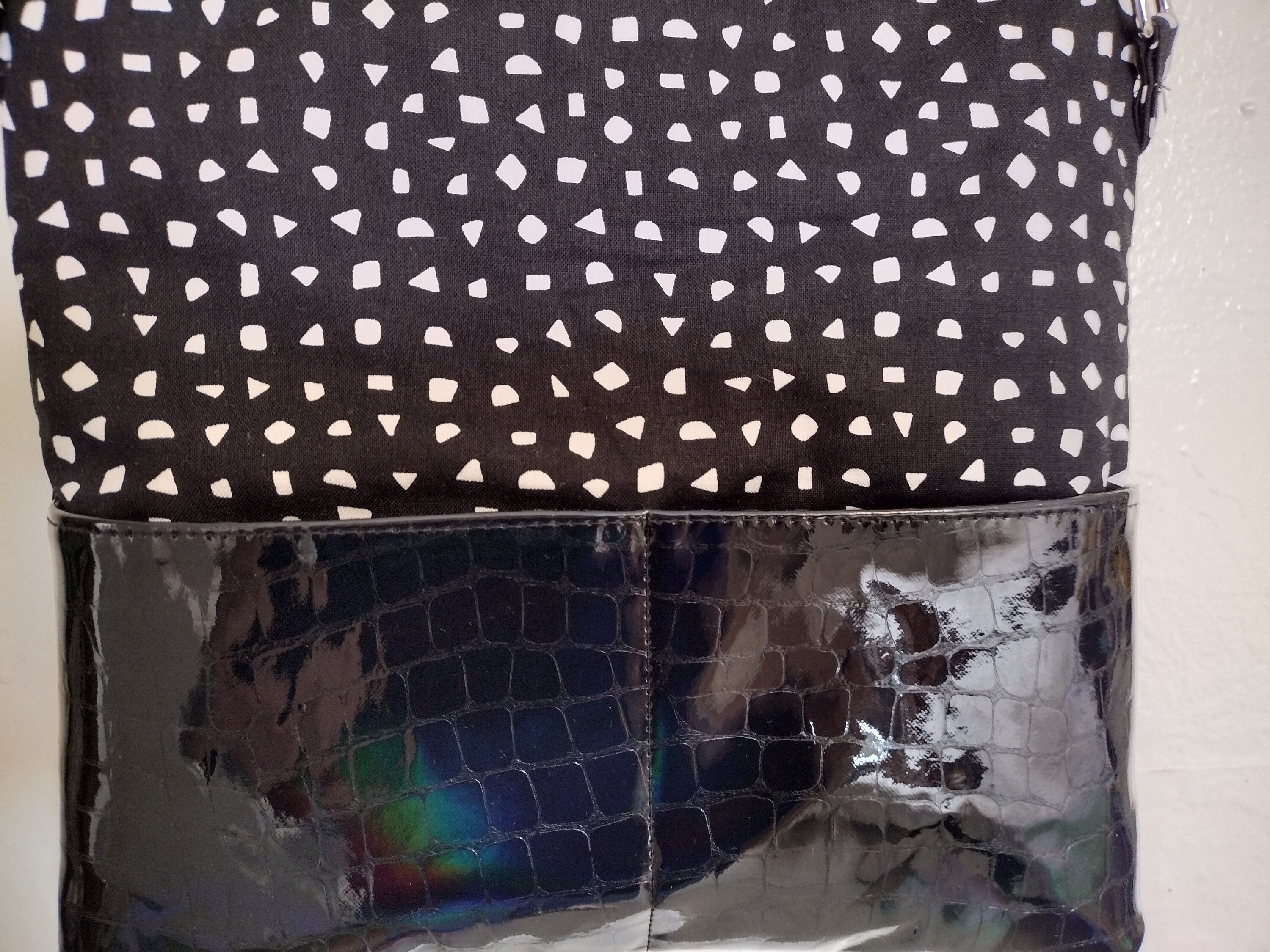This stylish shoulder bag features a black and white fabric with black shiny croc-embossed vinyl.