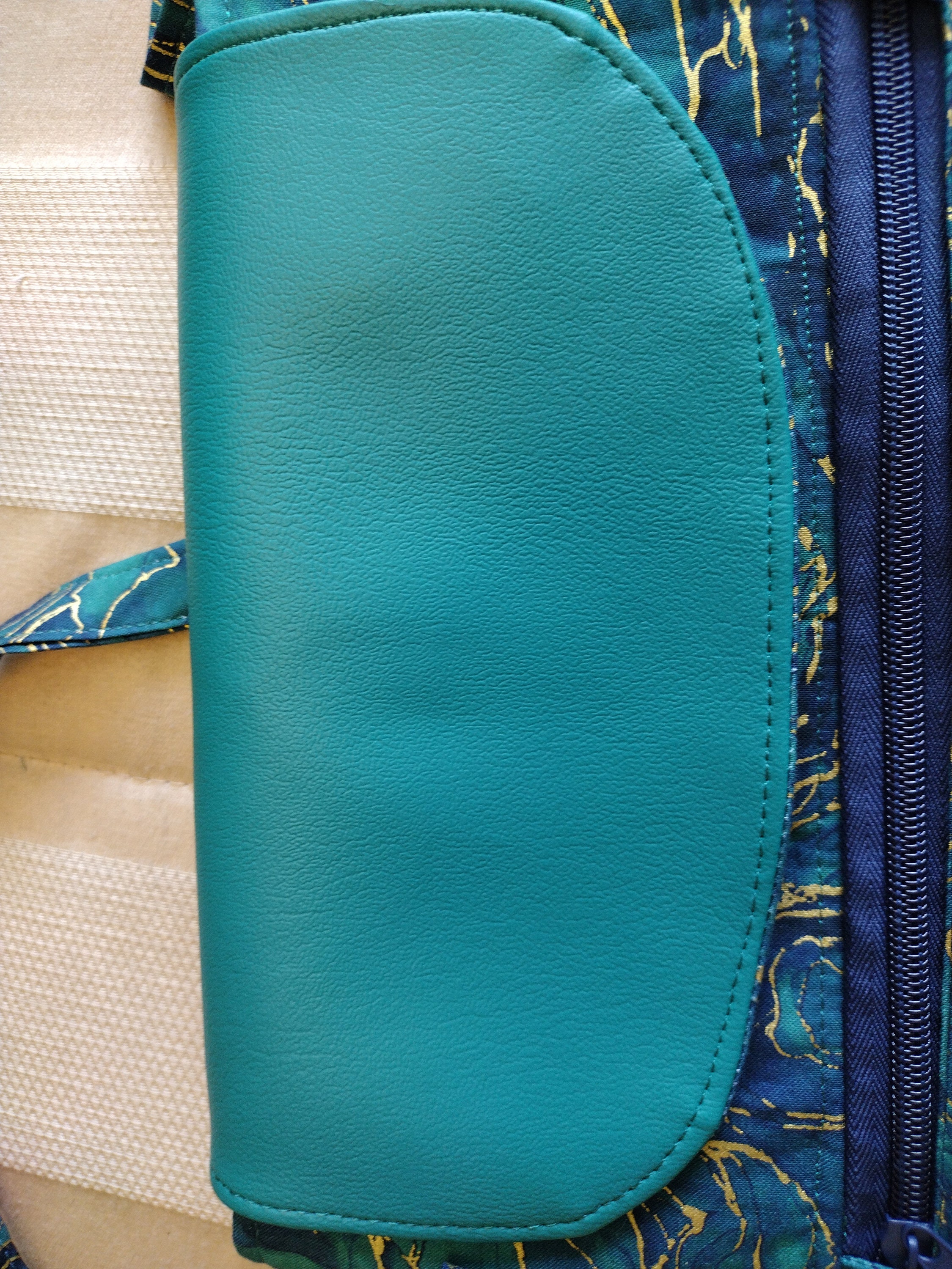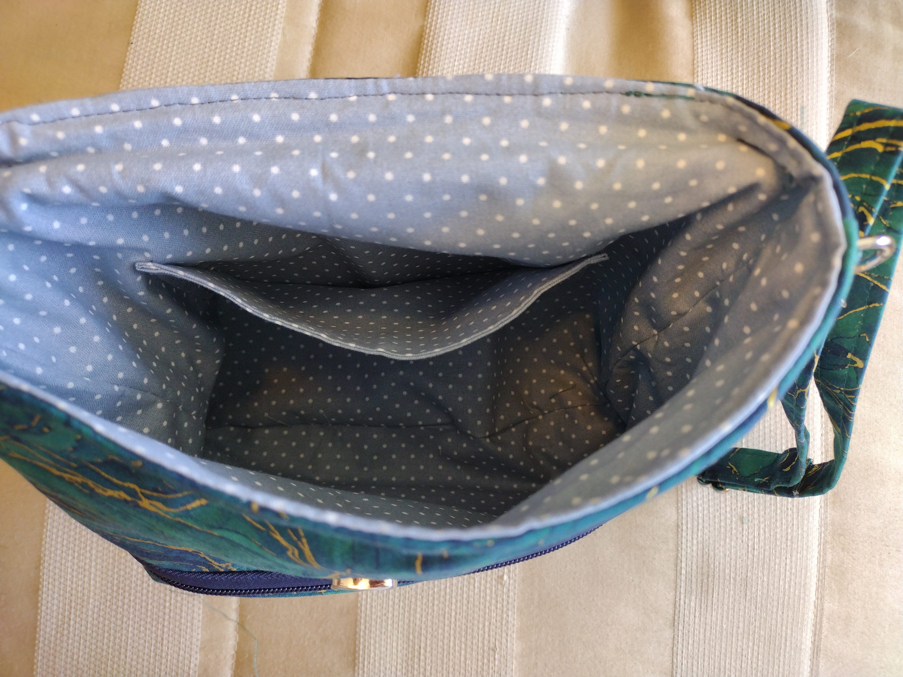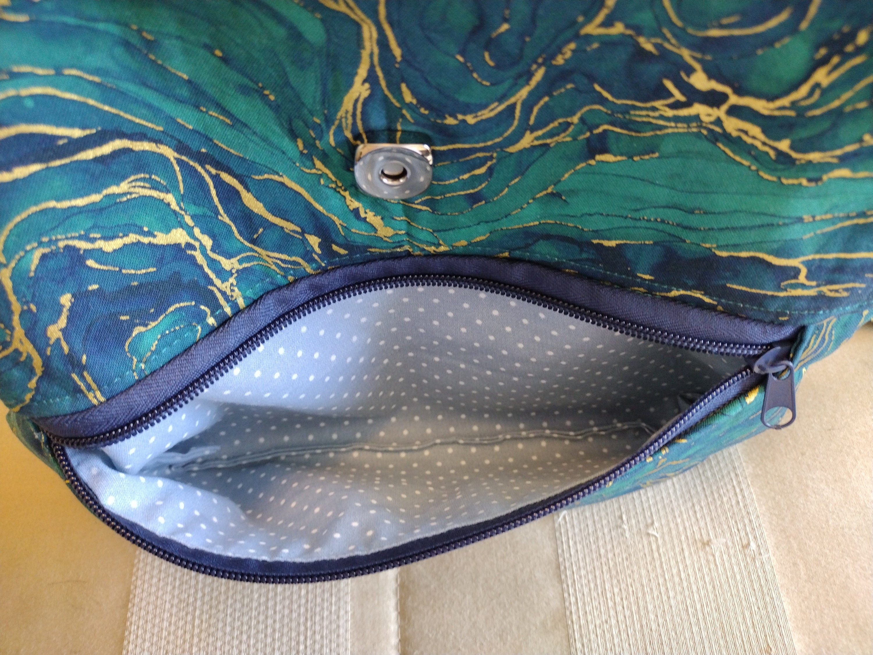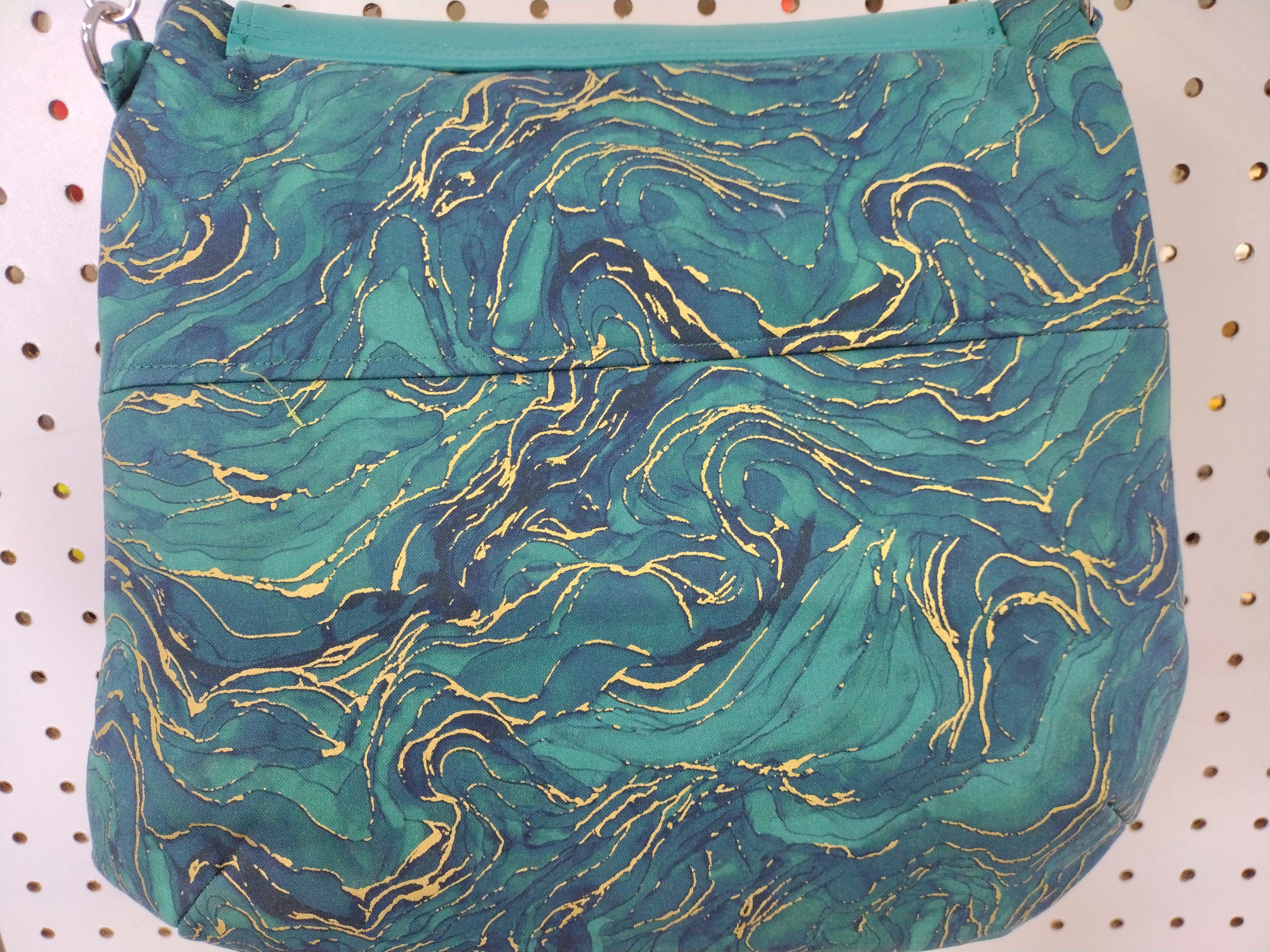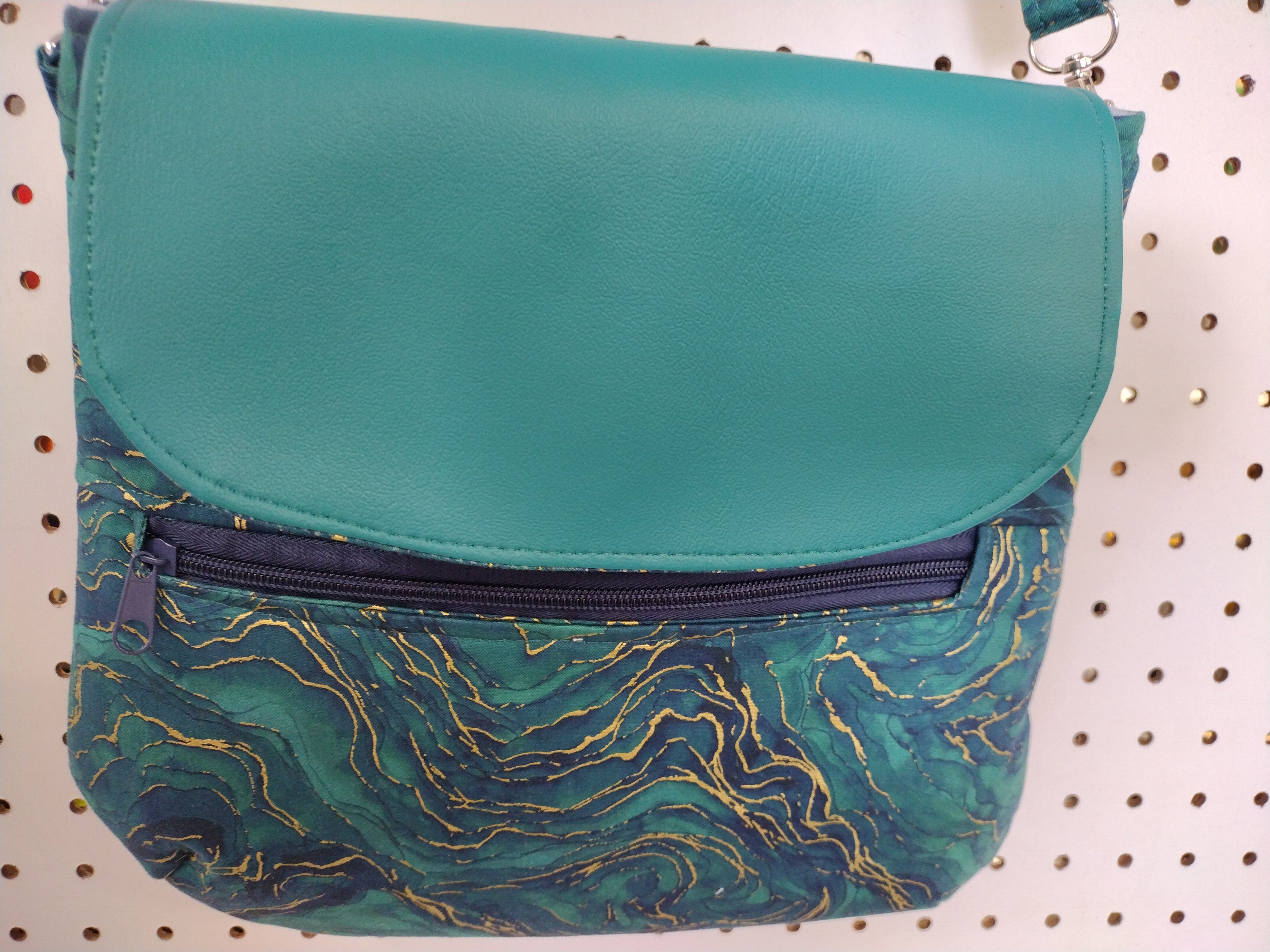 This charming crossbody bag is crafted from Midas Touch fabric by Deborah Edwards and Melanie Samra of Northcott in blues, teal, green and metallic gold. It features a zip pocket on the front and a magnetic snap flap closure at the top. The interior is lined with grey fabric featuring white dots, along with a slip pocket for added convenience.