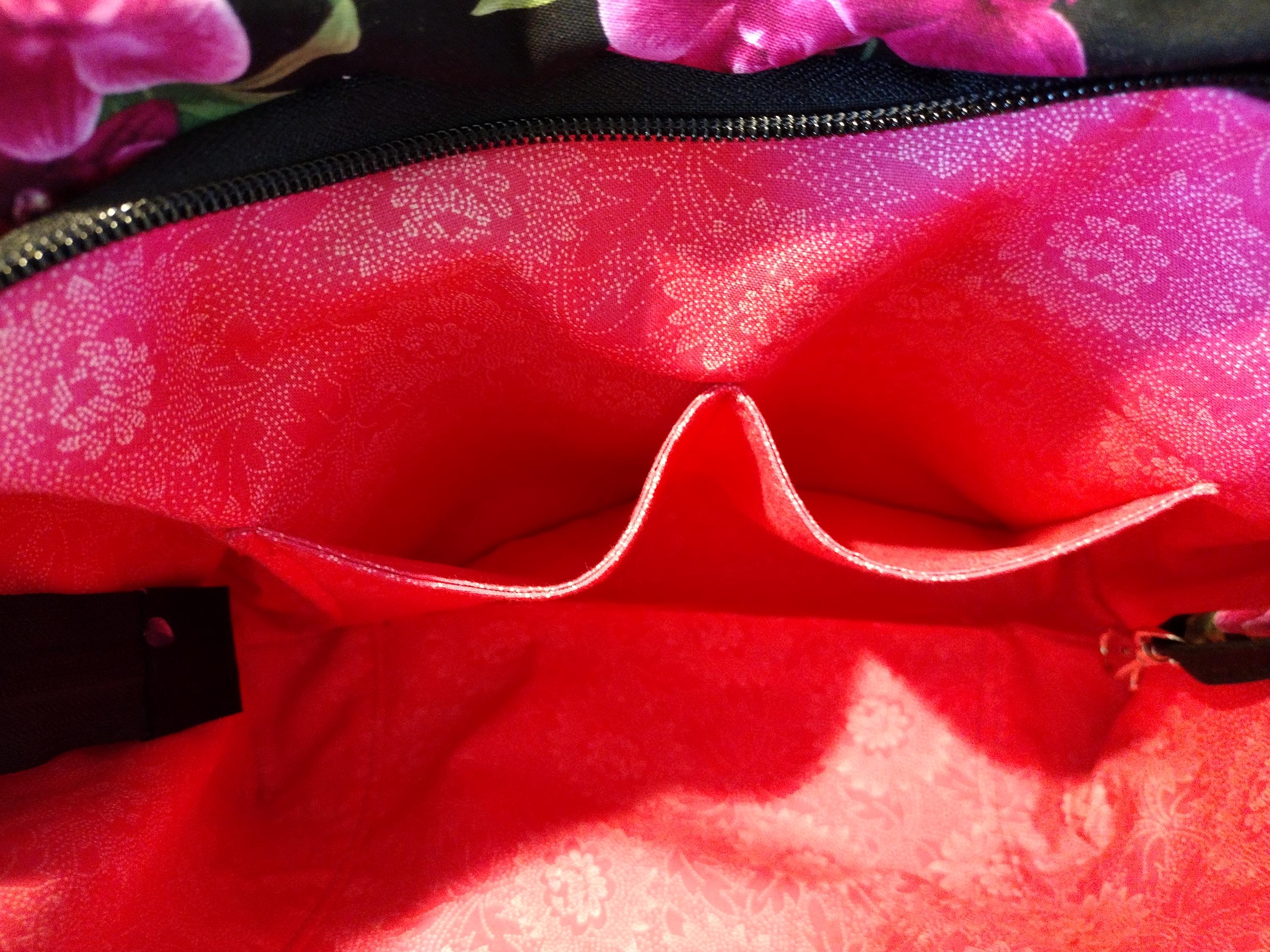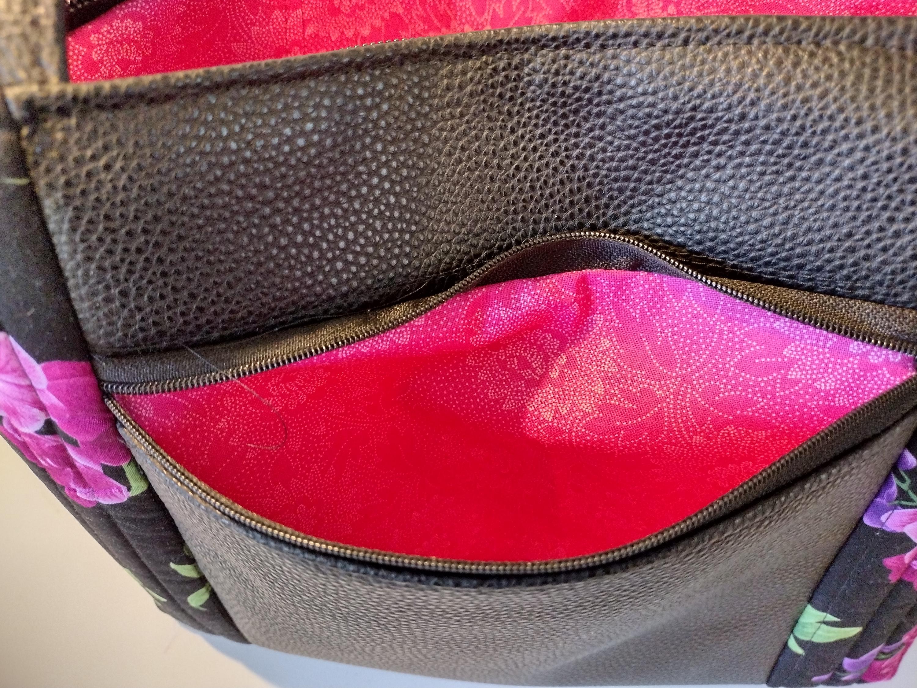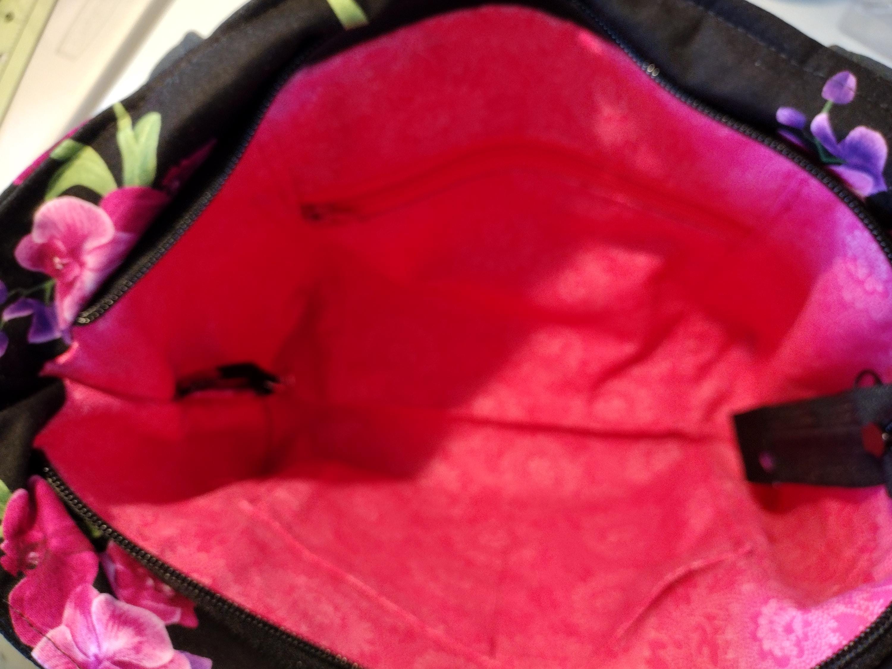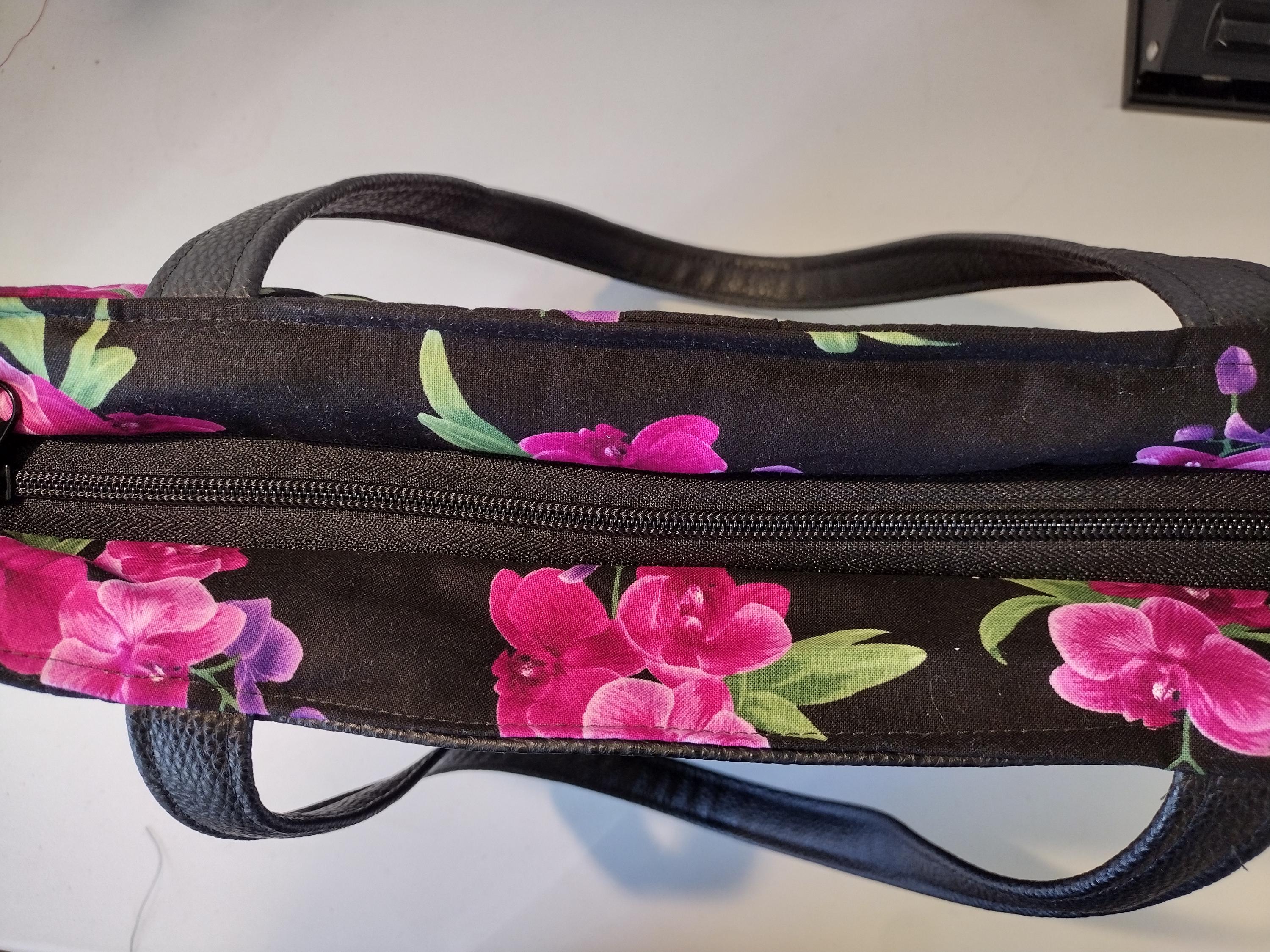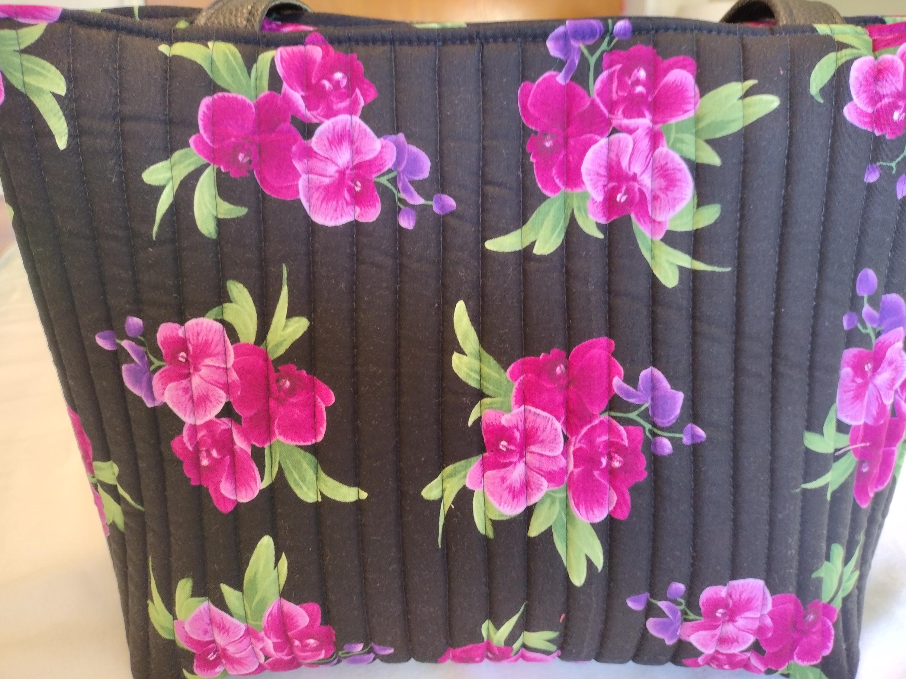This black with fuschia, pink and purple orchid fabric tote bag with pebbled black faux leather front piece and handles is a stunning piece, showcasing vibrant floral patterns that embody a whimsical garden aesthetic. Its quilted design adds texture and durability, making it perfect for everyday use or special occasions. The spacious interior and sturdy handles enhance its practicality while maintaining an eye-catching style. Whether for shopping, travel, or as a unique gift, this tote bag is both functional and beautifully artistic.