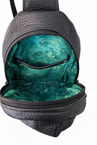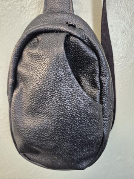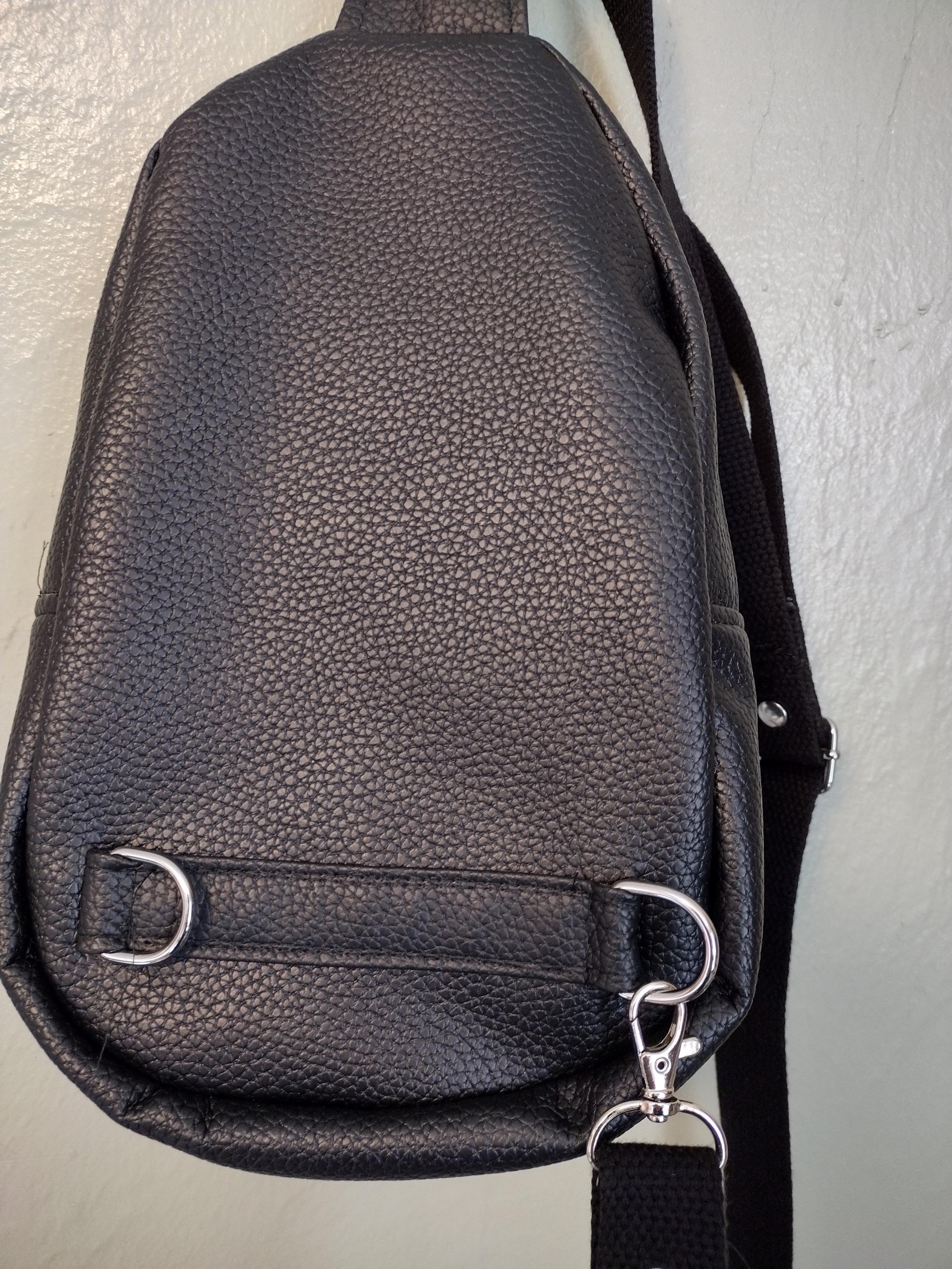 Black faux leather sling bag - perfect for hands free shopping or travel. This has an outside slip pocket, zipper enclosure and inside slip pocket. It may be switched from left side to right side. Large enough to carry water bottle