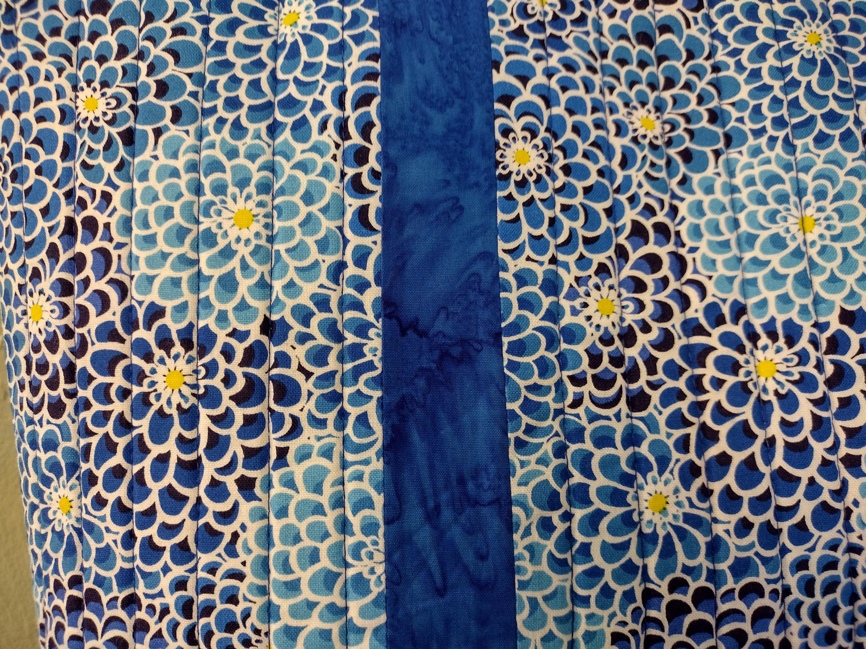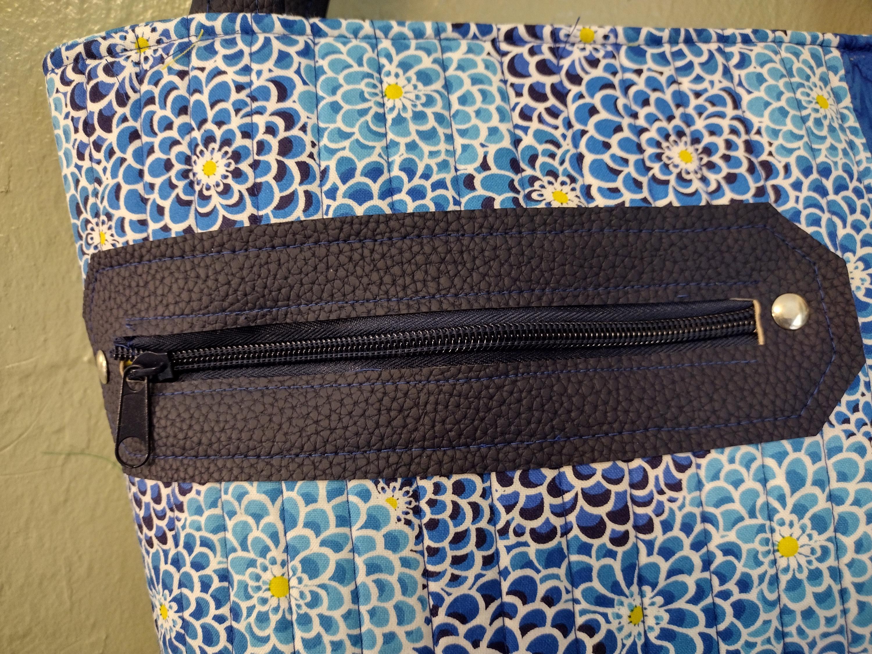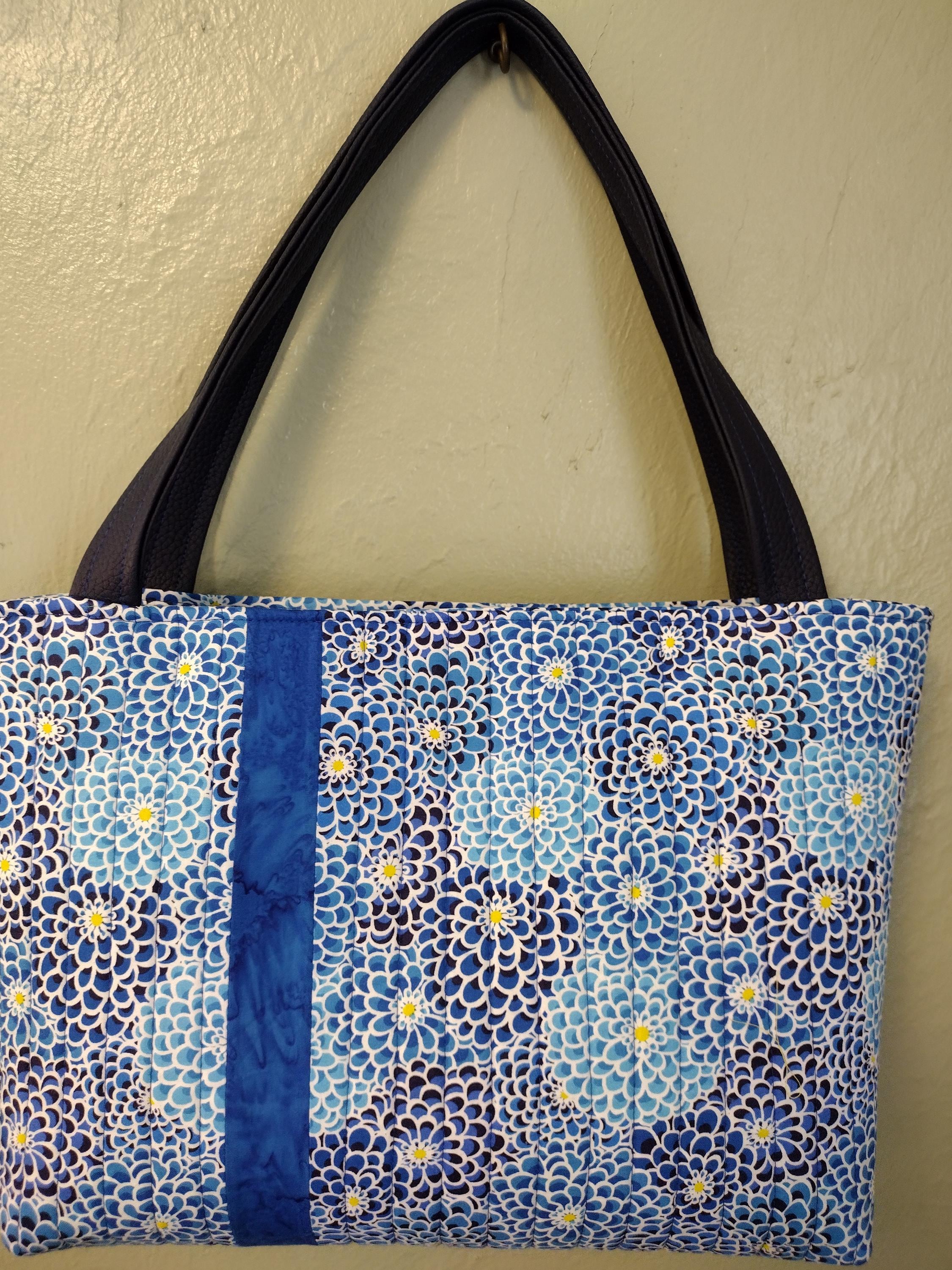 Beautiful quilted Blue Dahlia fabric in shades of blue with white outlines and yellow cemters and blue batik accent piece. The handles and accent are indigo faux leather