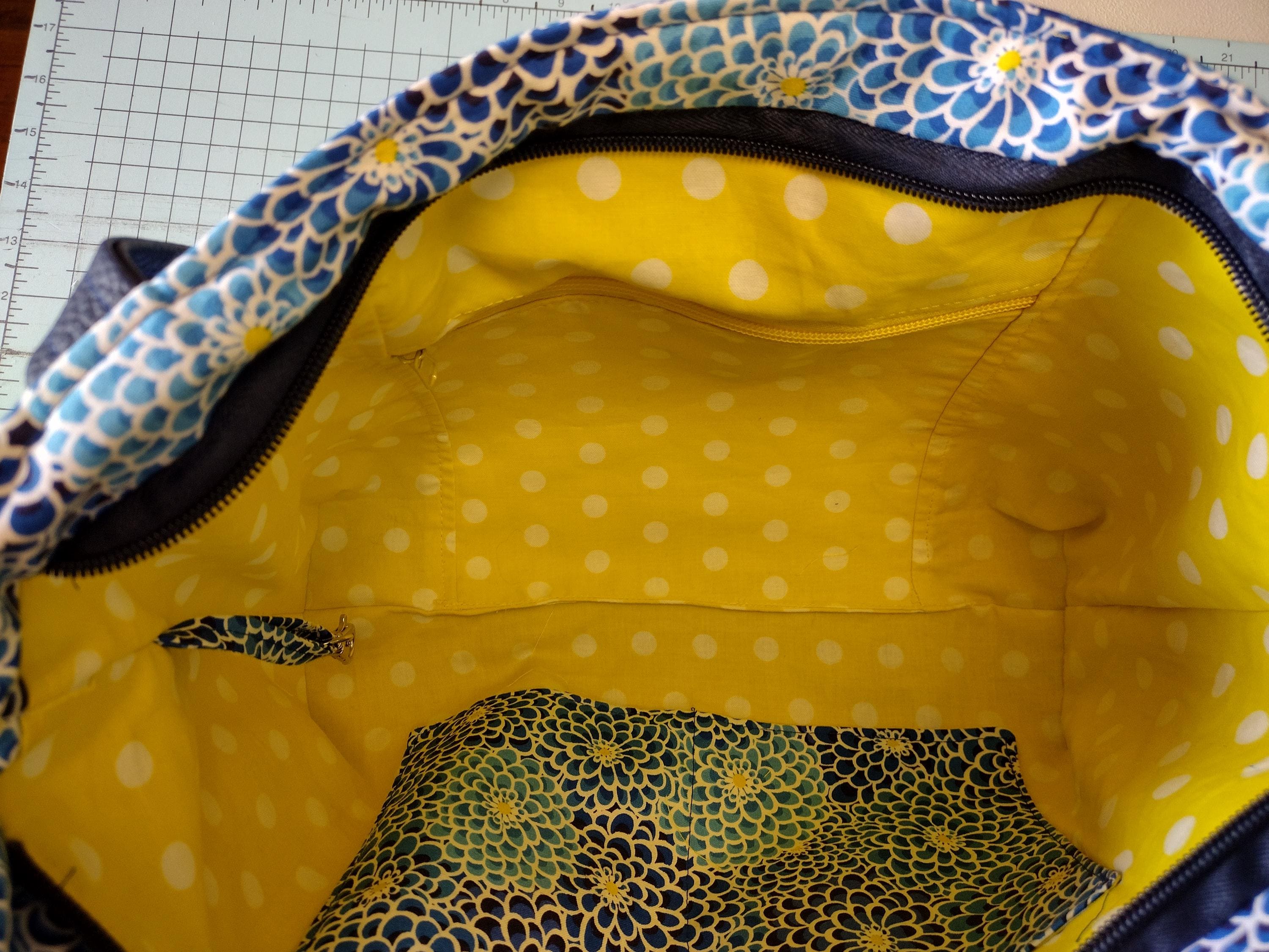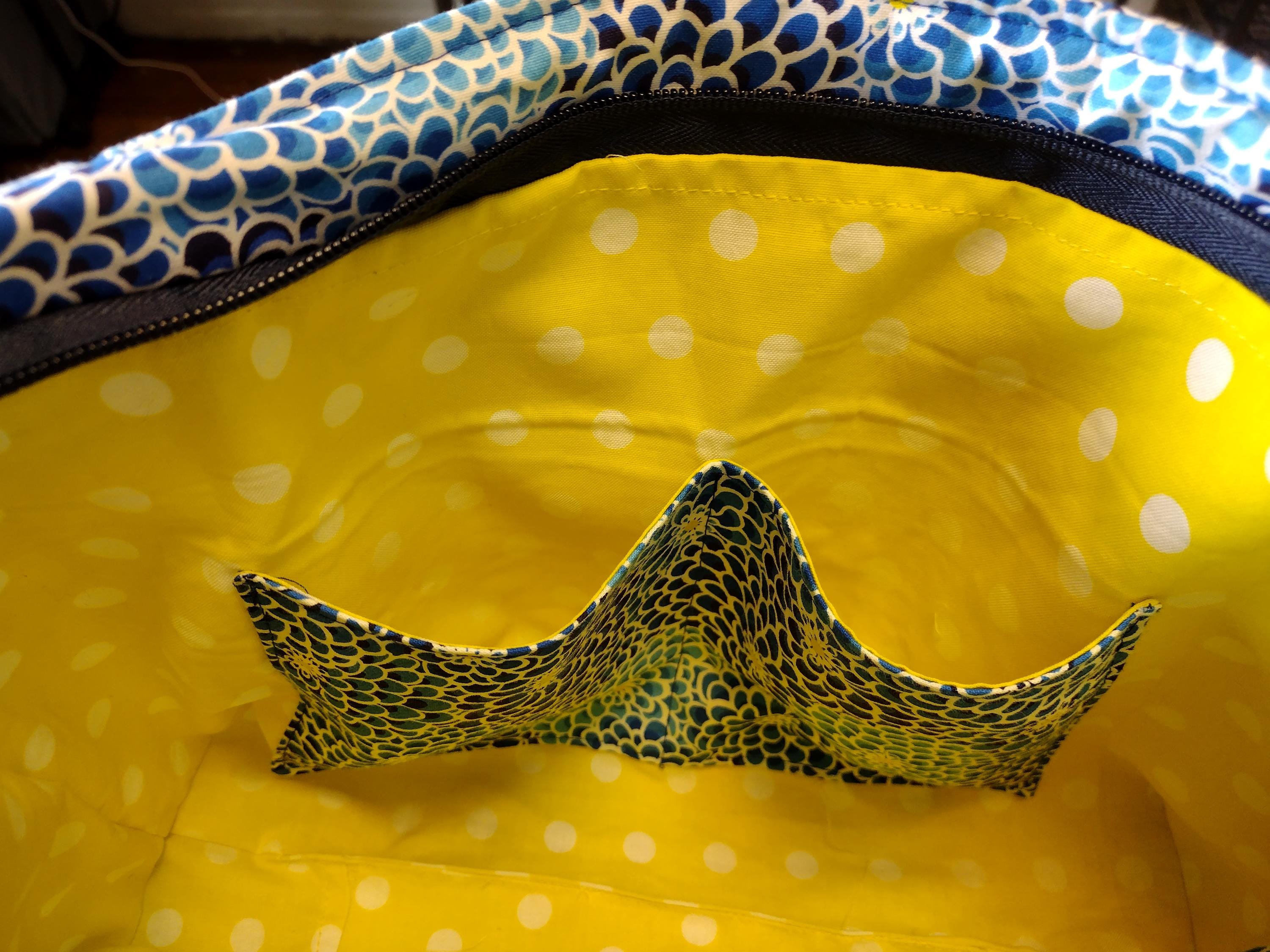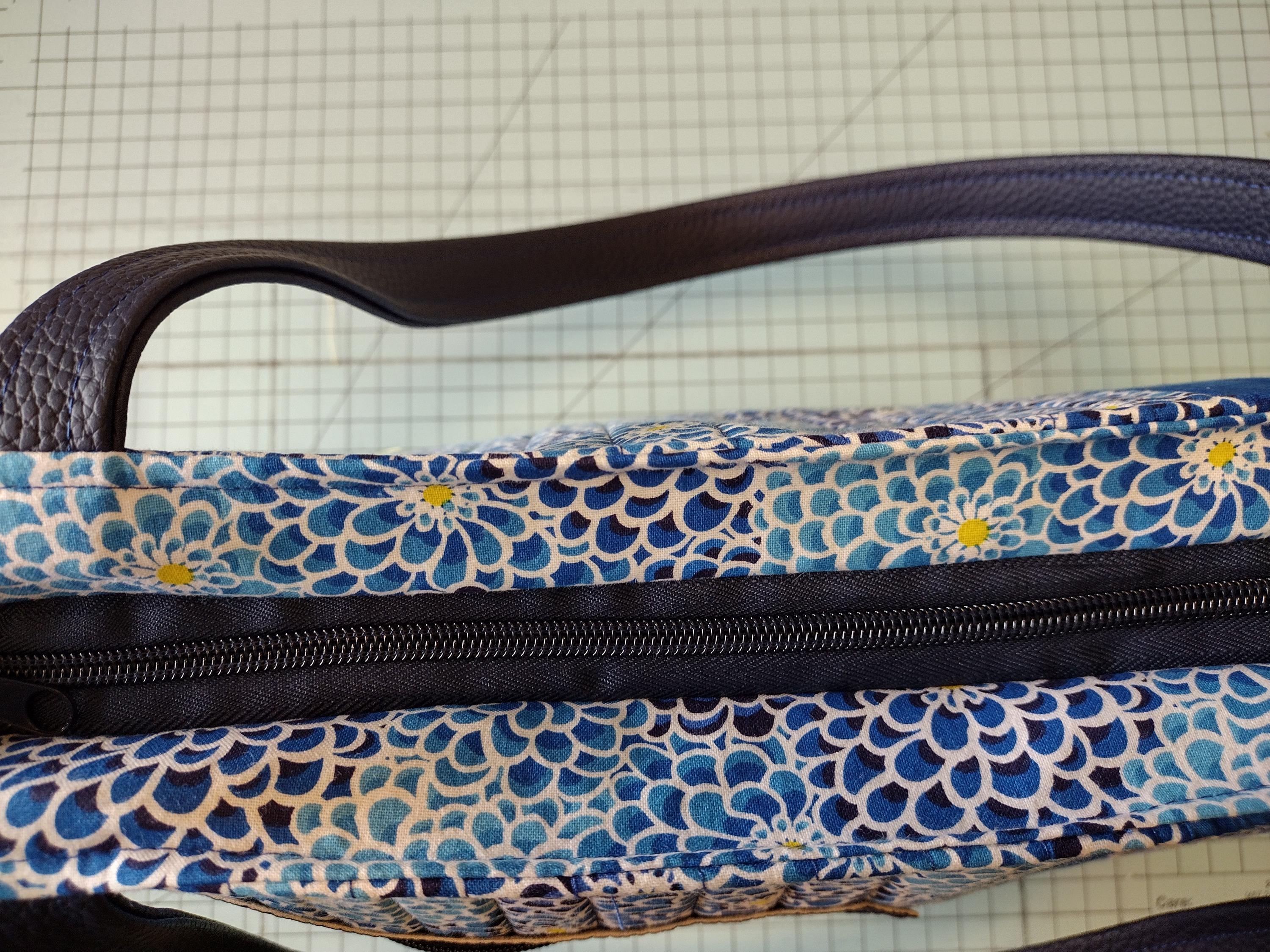 Beautiful quilted Blue Dahlia fabric in shades of blue with white outlines and yellow cemters and blue batik accent piece. The handles and accent are indigo faux leather