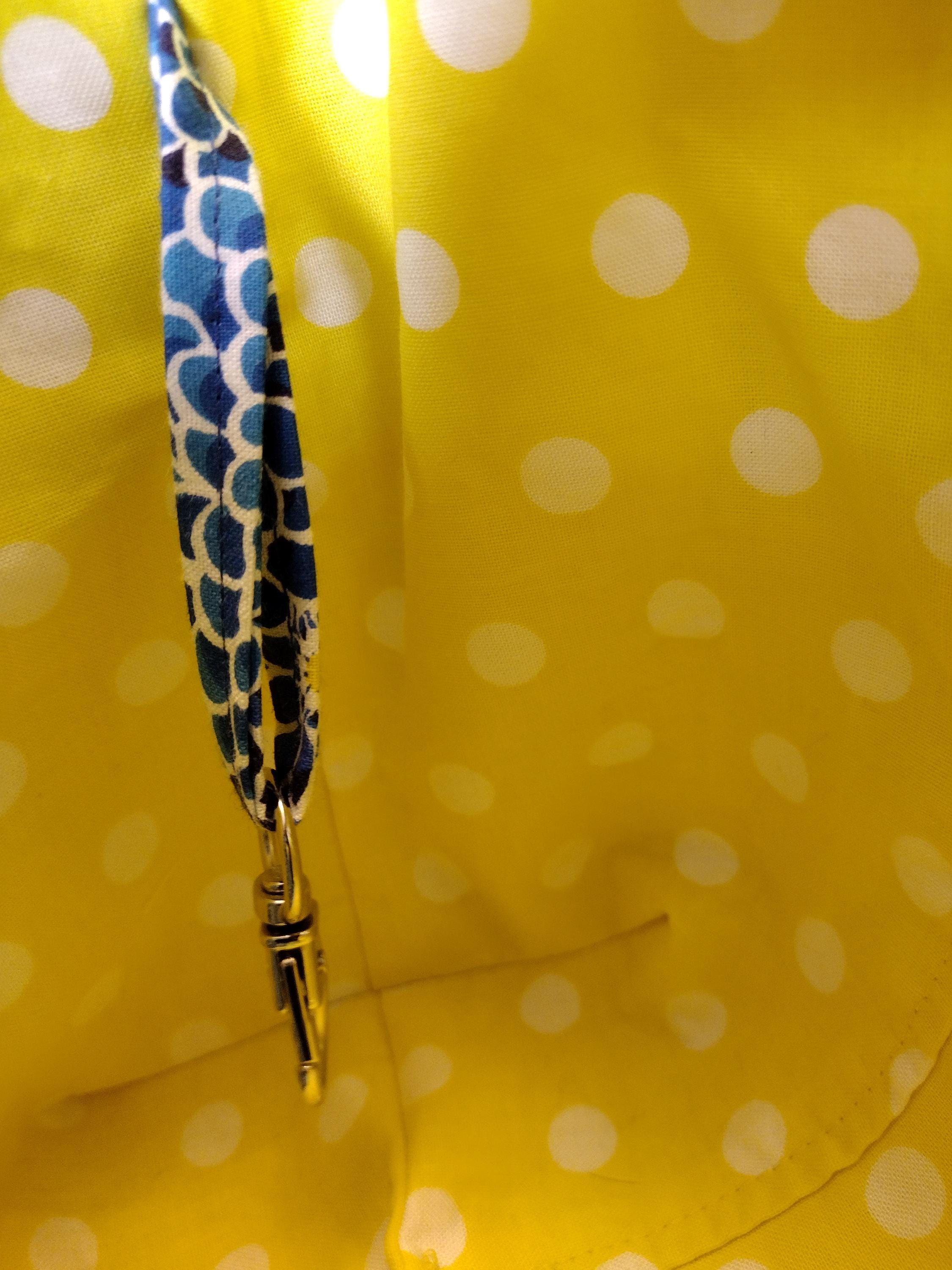 This has a top zipper closure. Inside is cherry yellow with white dots lining with a divided slip pocket and a zip pocket. Also has a key leash inside.