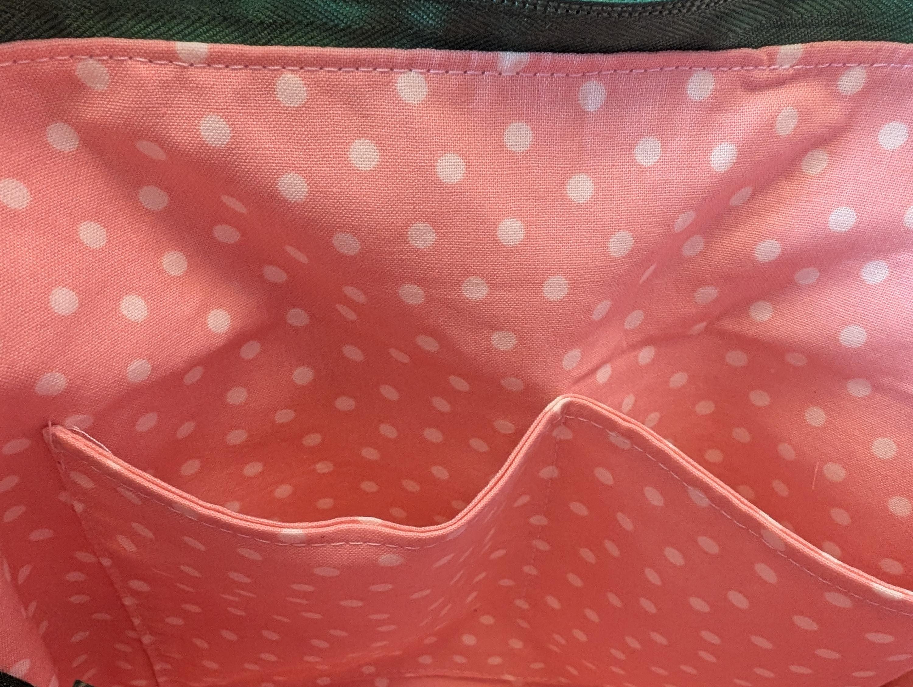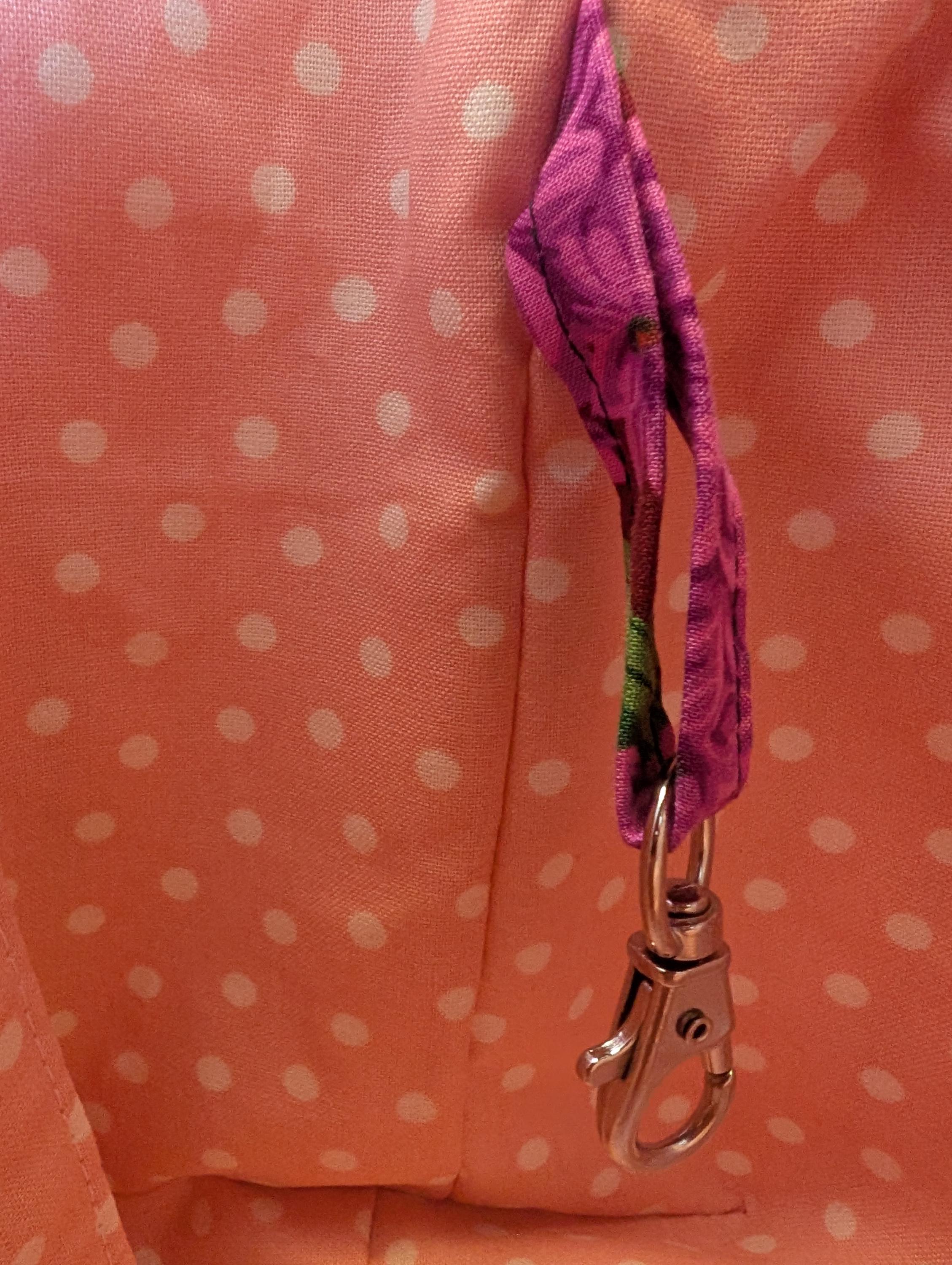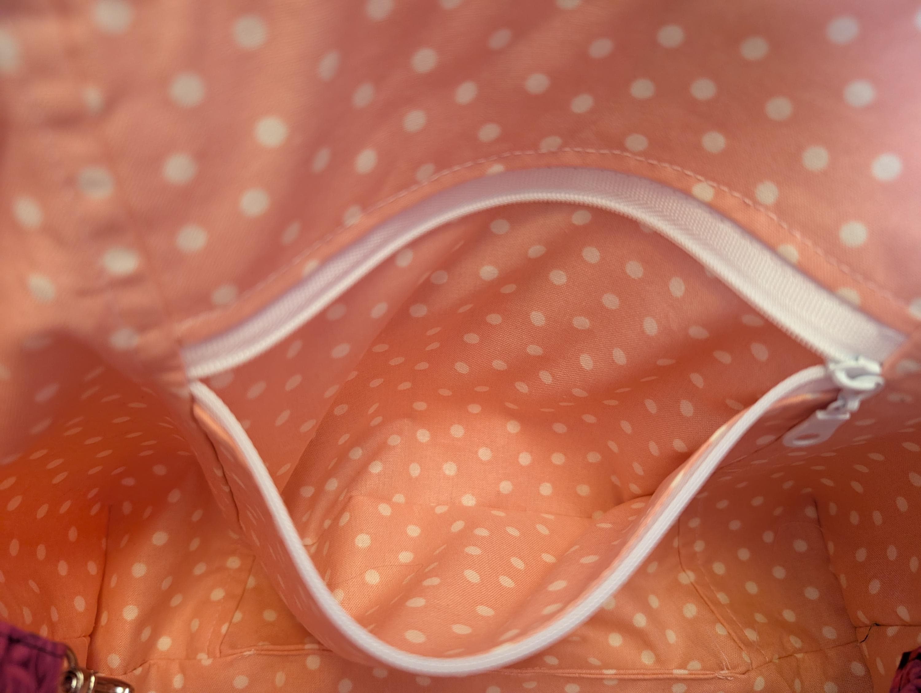 This has a top zipper closure. Inside is pink with white dots lining with a divided slip pocket and a zip pocket. Also has a key leash inside.