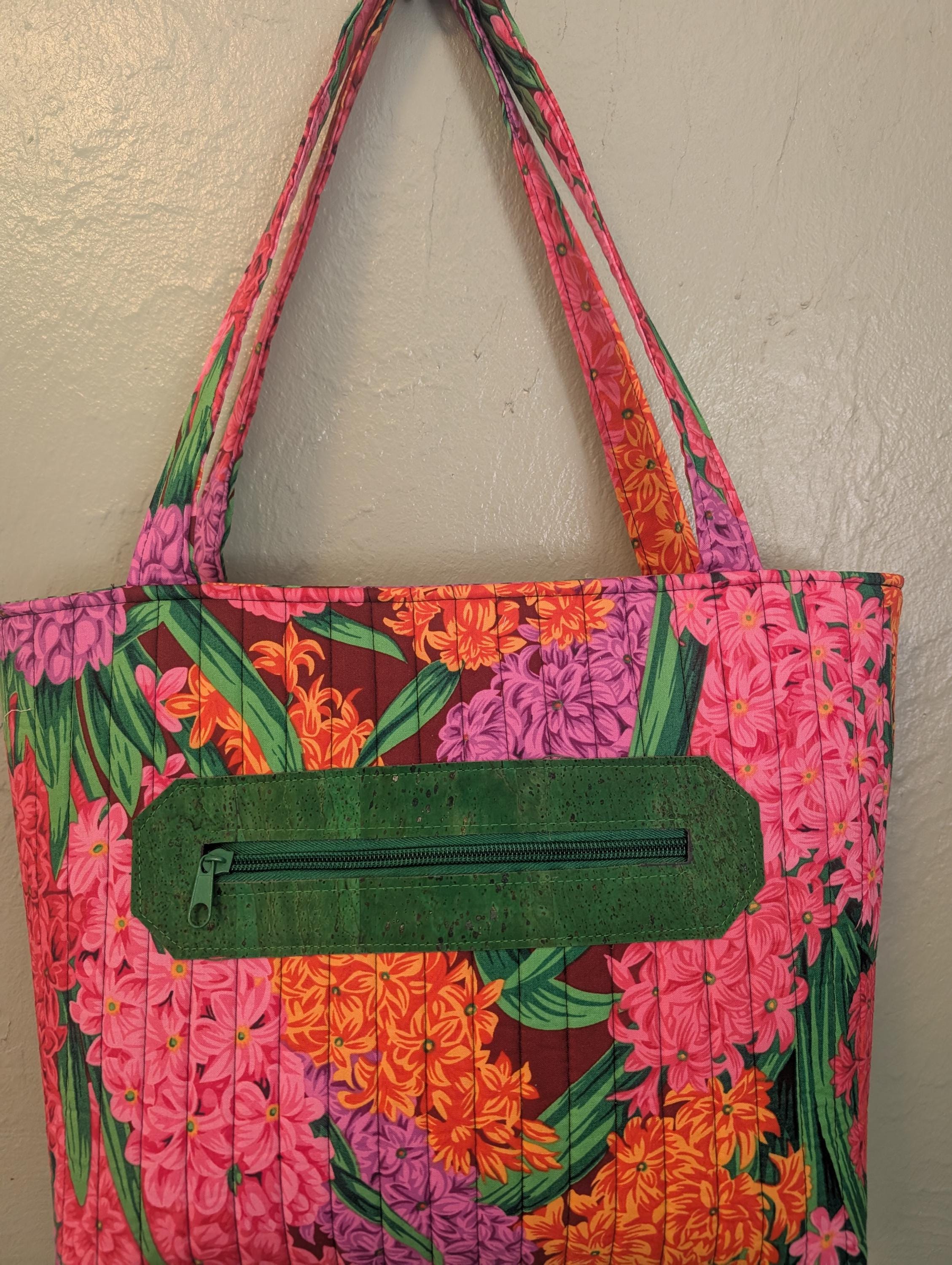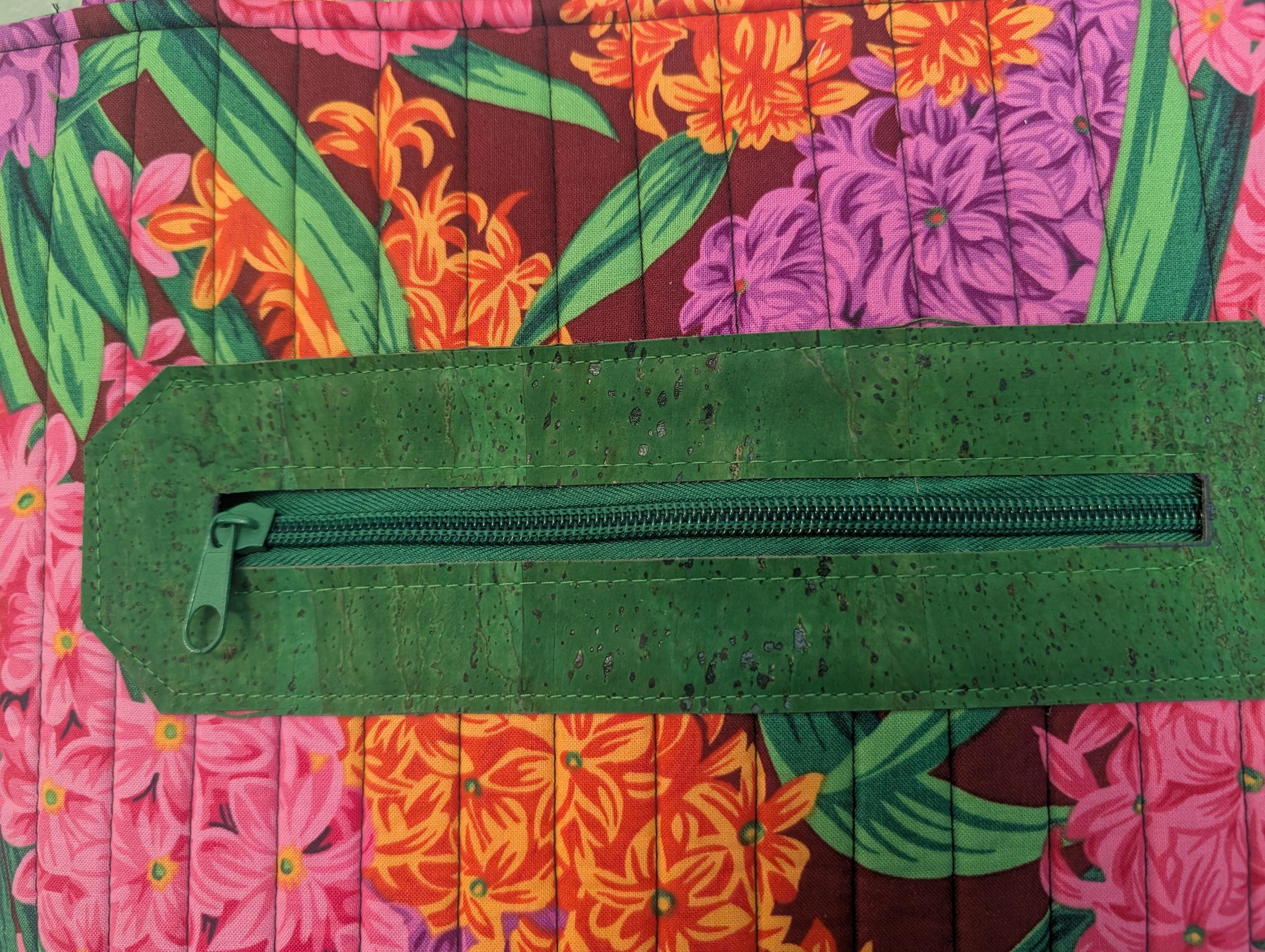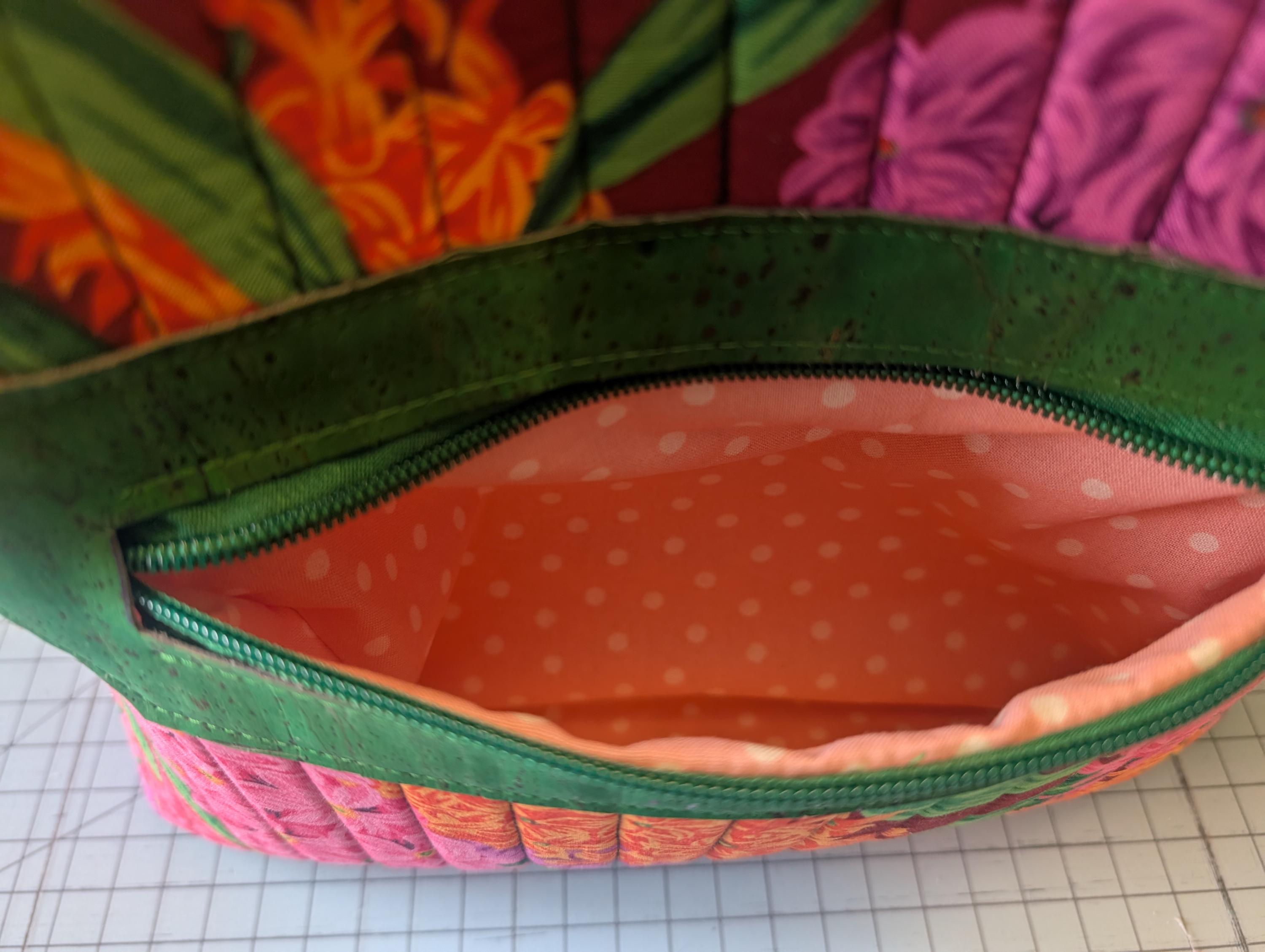 Beautiful quilted Kaffe Fassett Philip Jacobs Hyacinthus fabric in pinks, purples, orange and green. Green Cork Overlay on front zipper