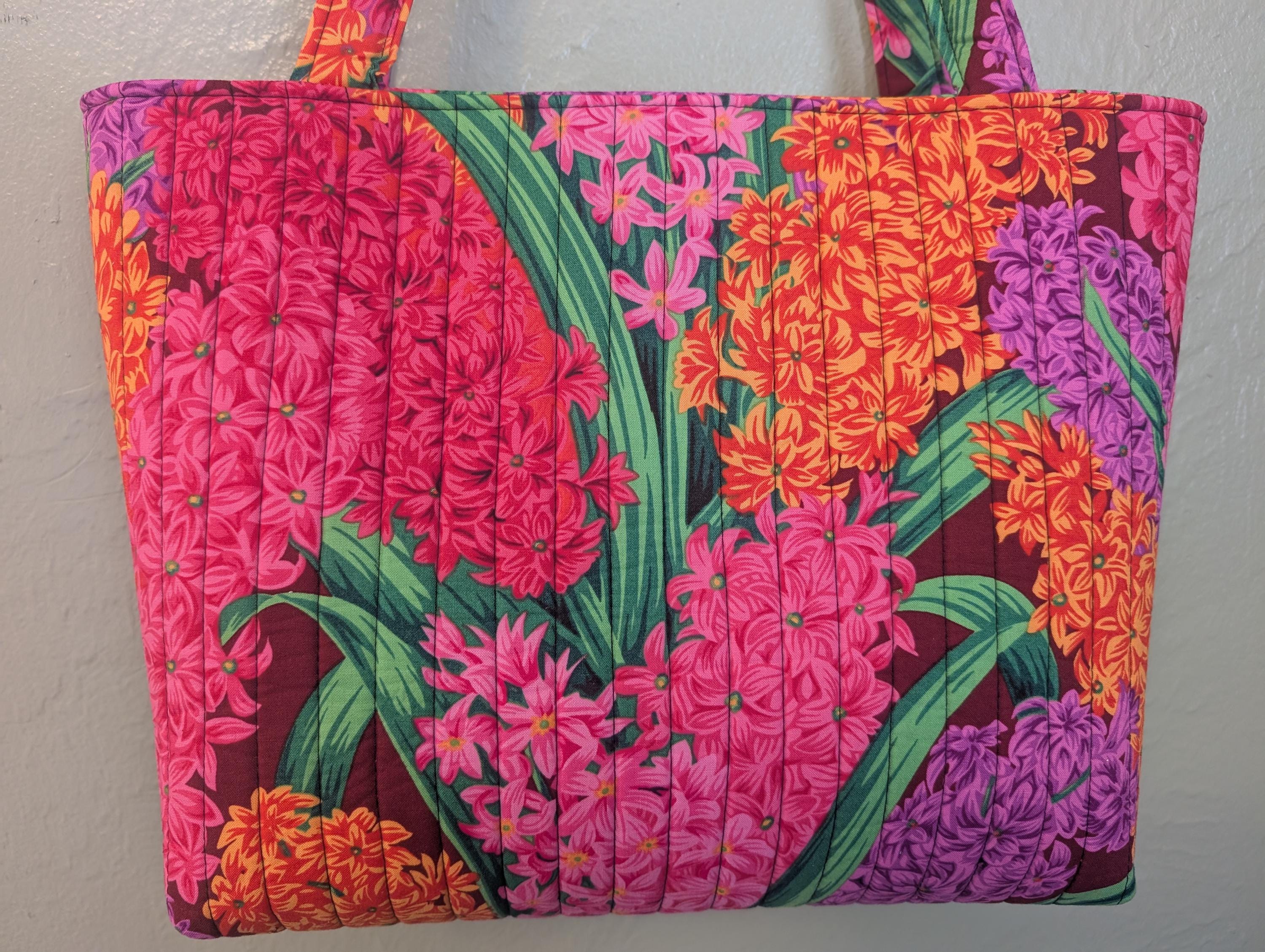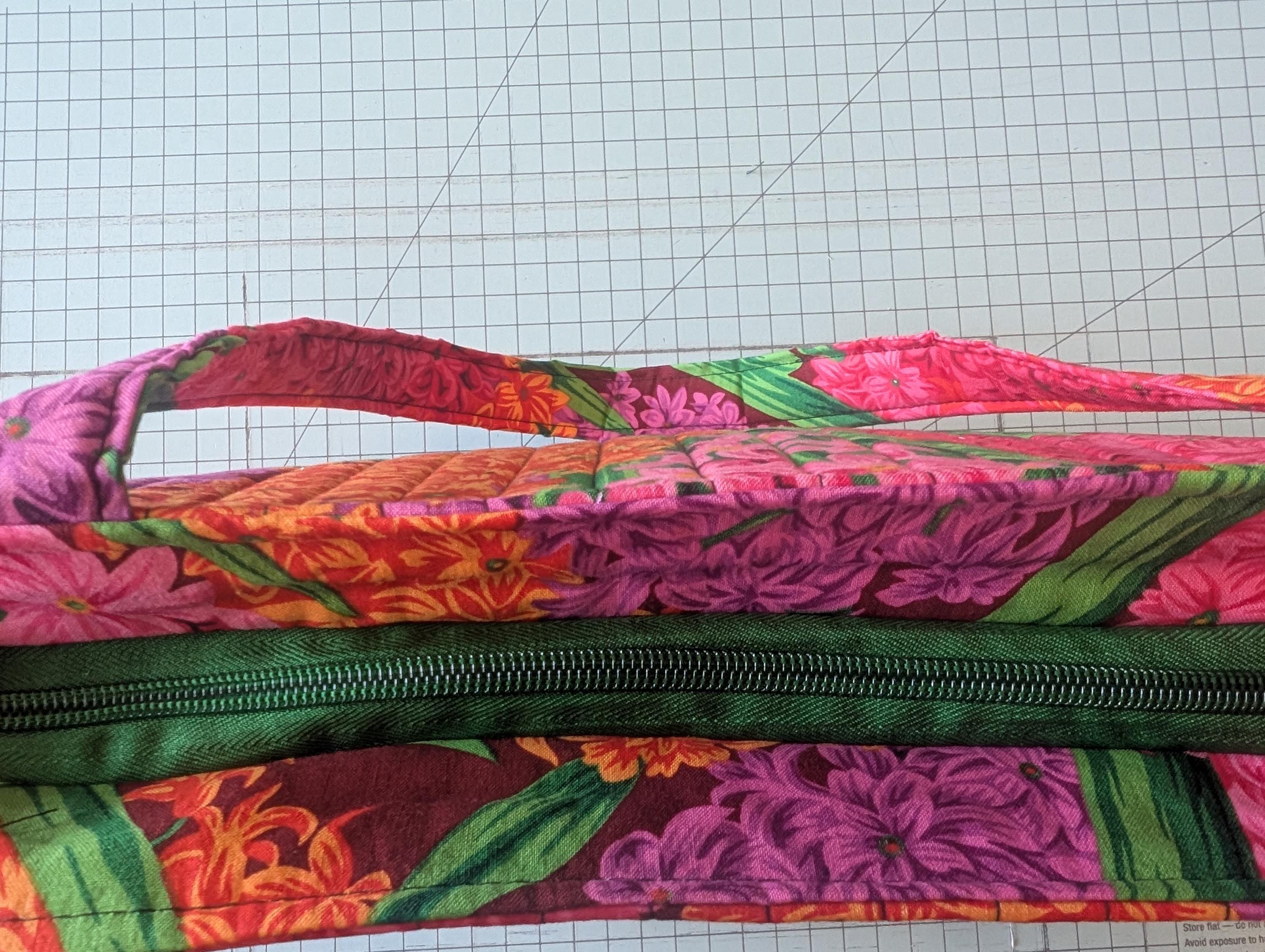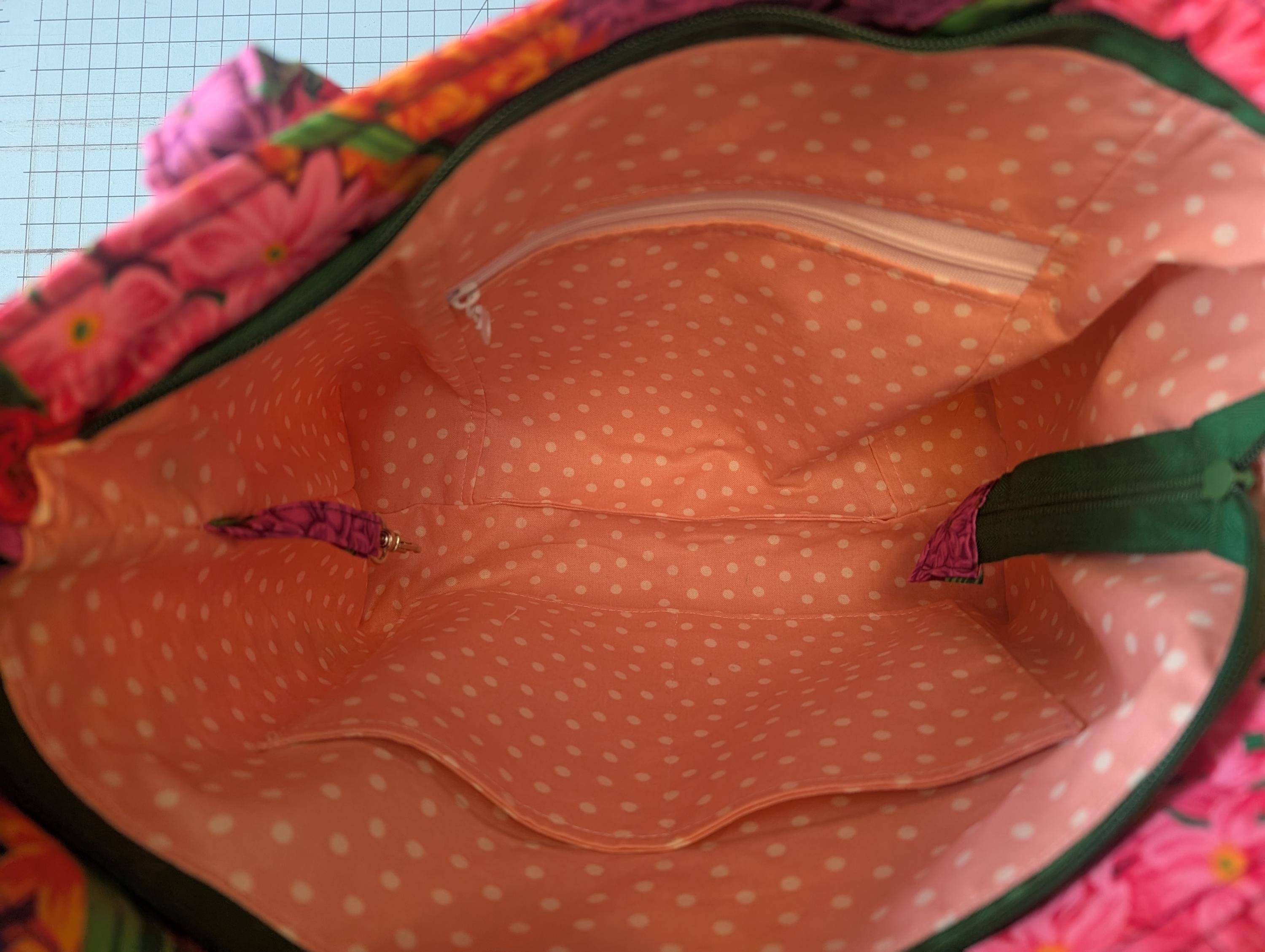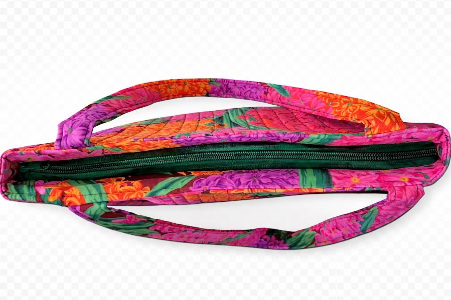 Beautiful quilted Kaffe Fassett Philip Jacobs Hyacinthus fabric in pinks, purples, orange and green. Green Cork Overlay on front zipper