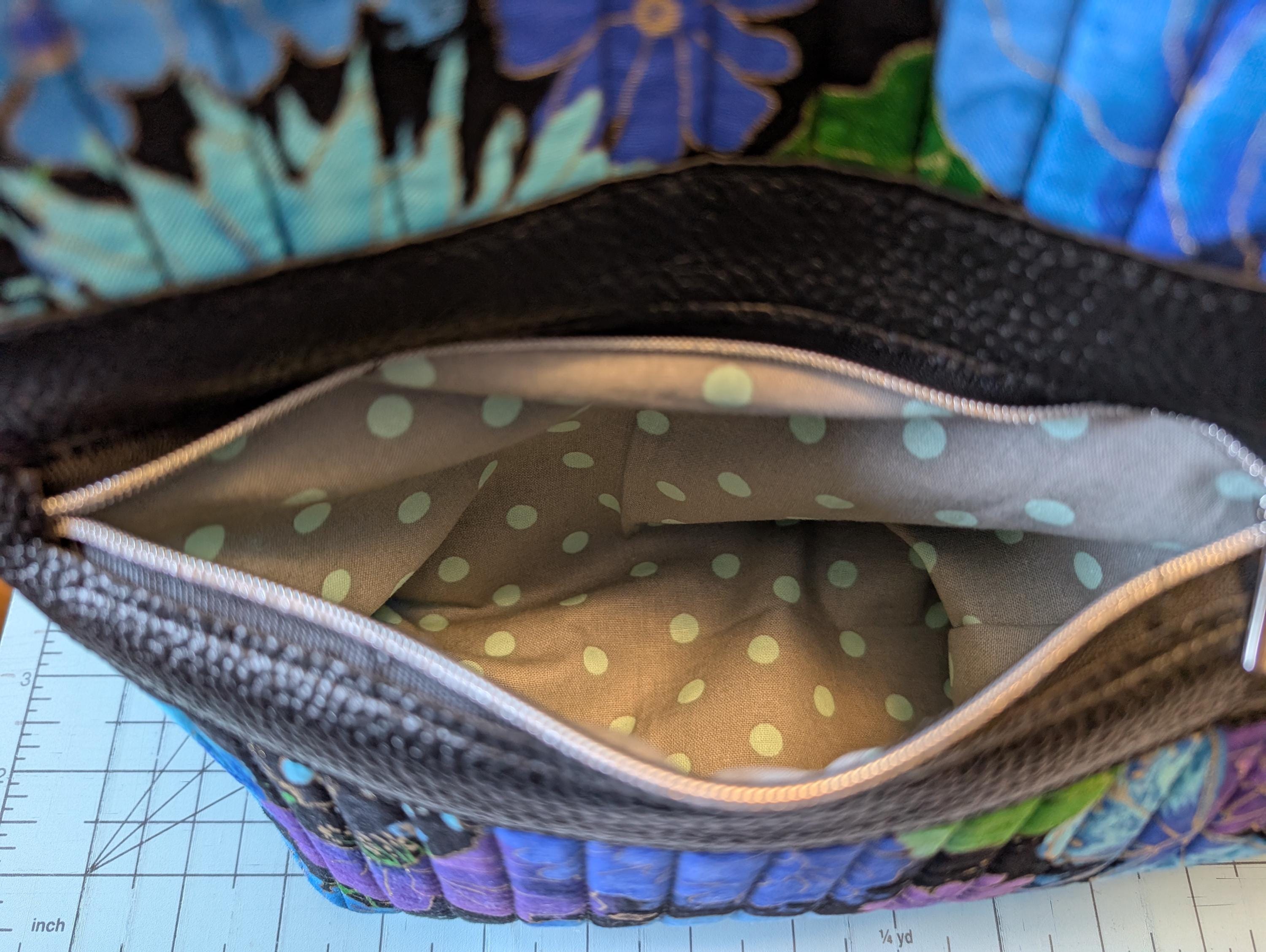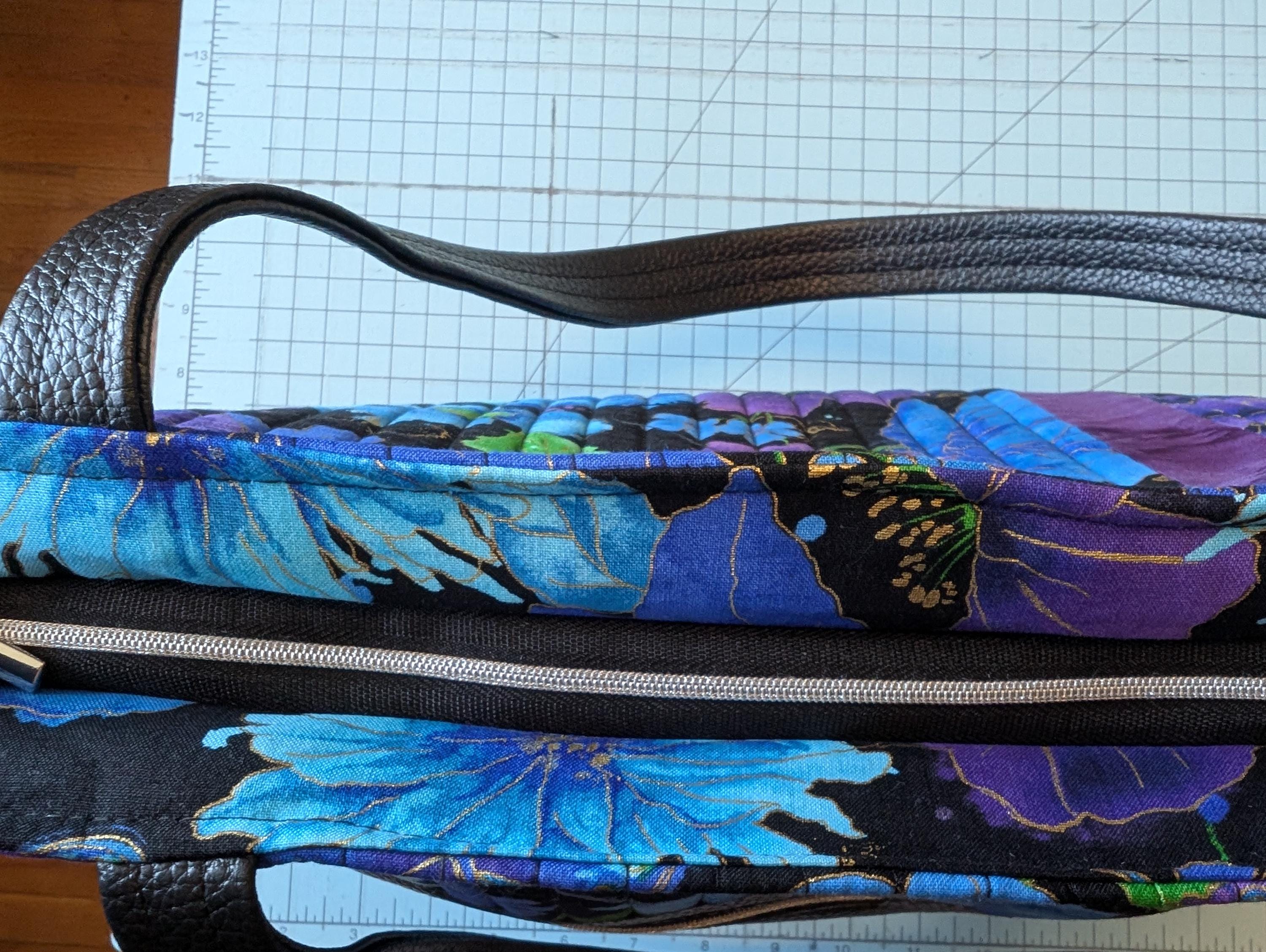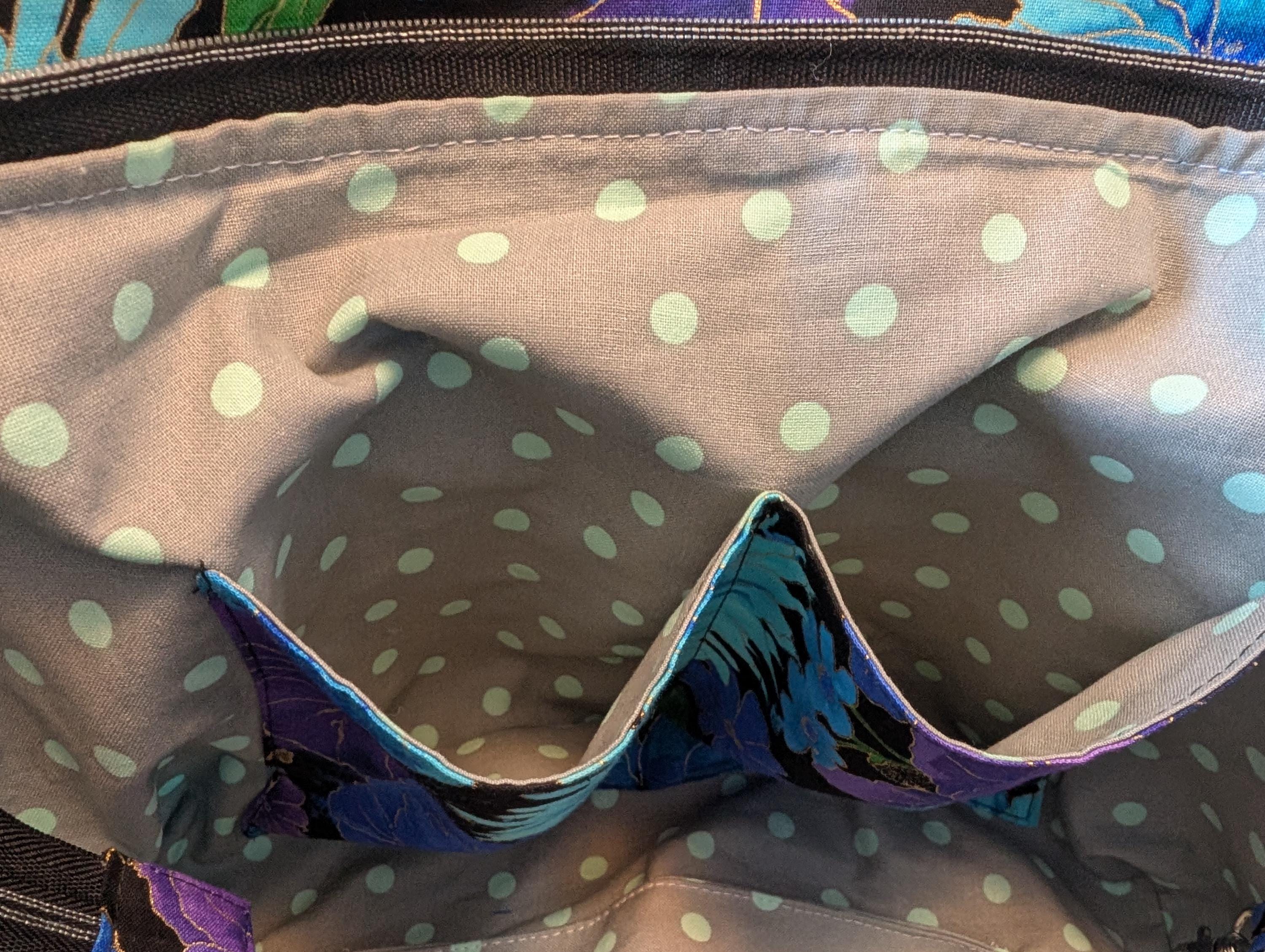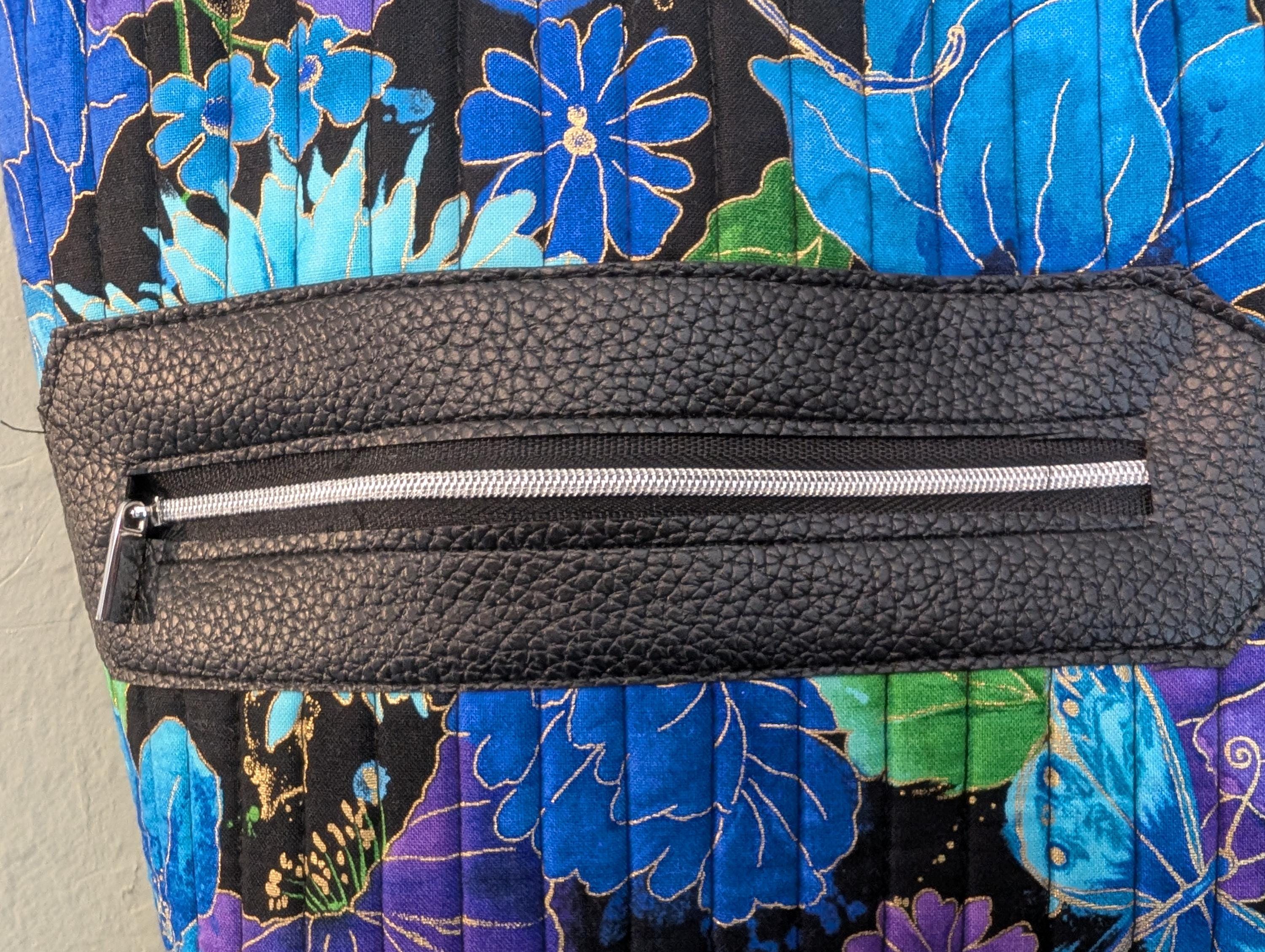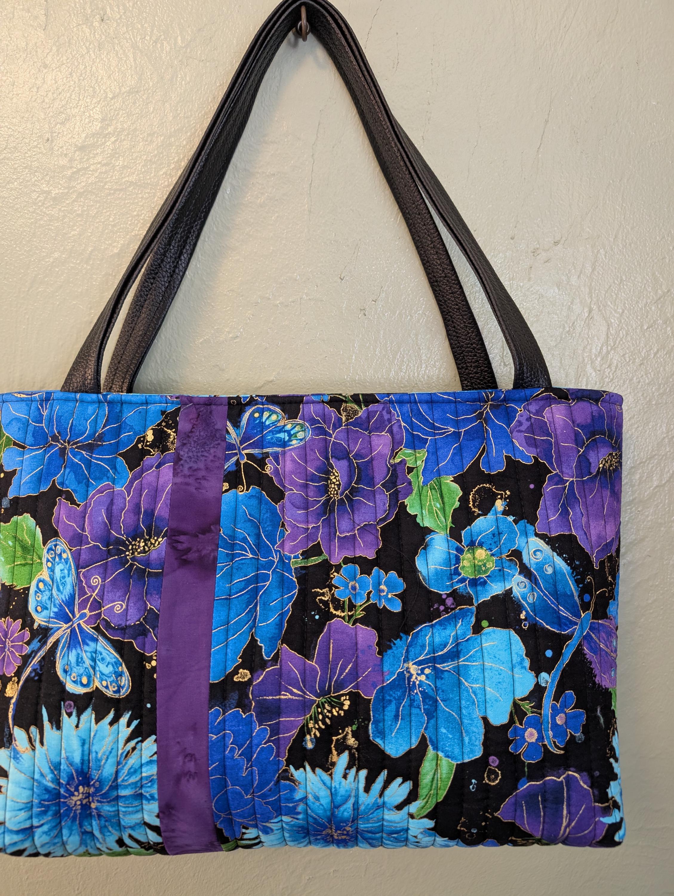 Beautiful quilted fabric in black, blue, green and purple flowers and Dragon Flies, with purple batik accent piece. The handles and accent are black faux leather