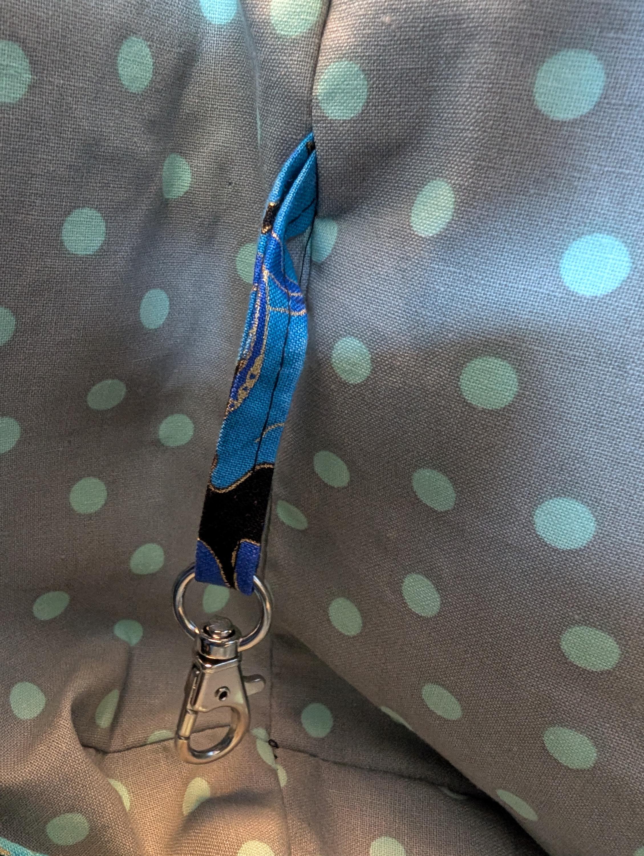 This has a top zipper closure. Inside is grey with aqua dots lining with a divided slip pocket and a zip pocket. Also has a key leash inside.