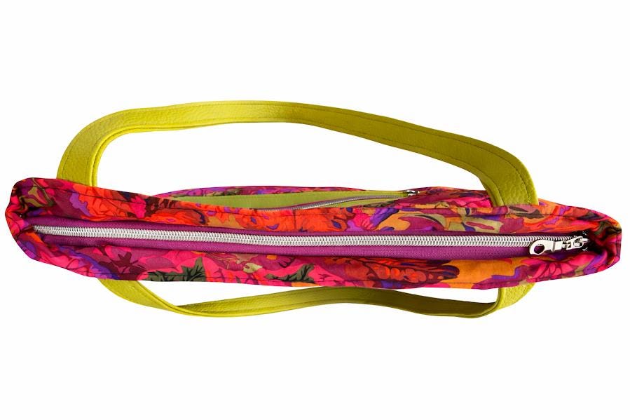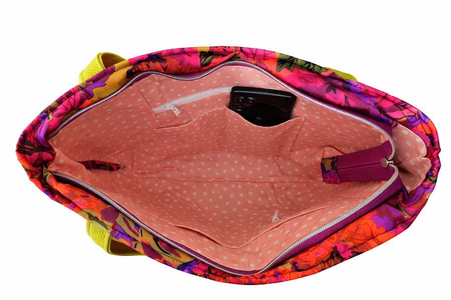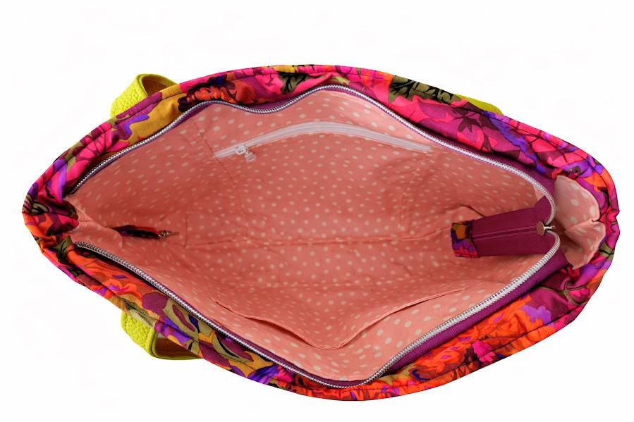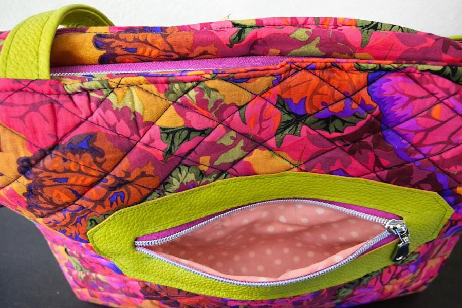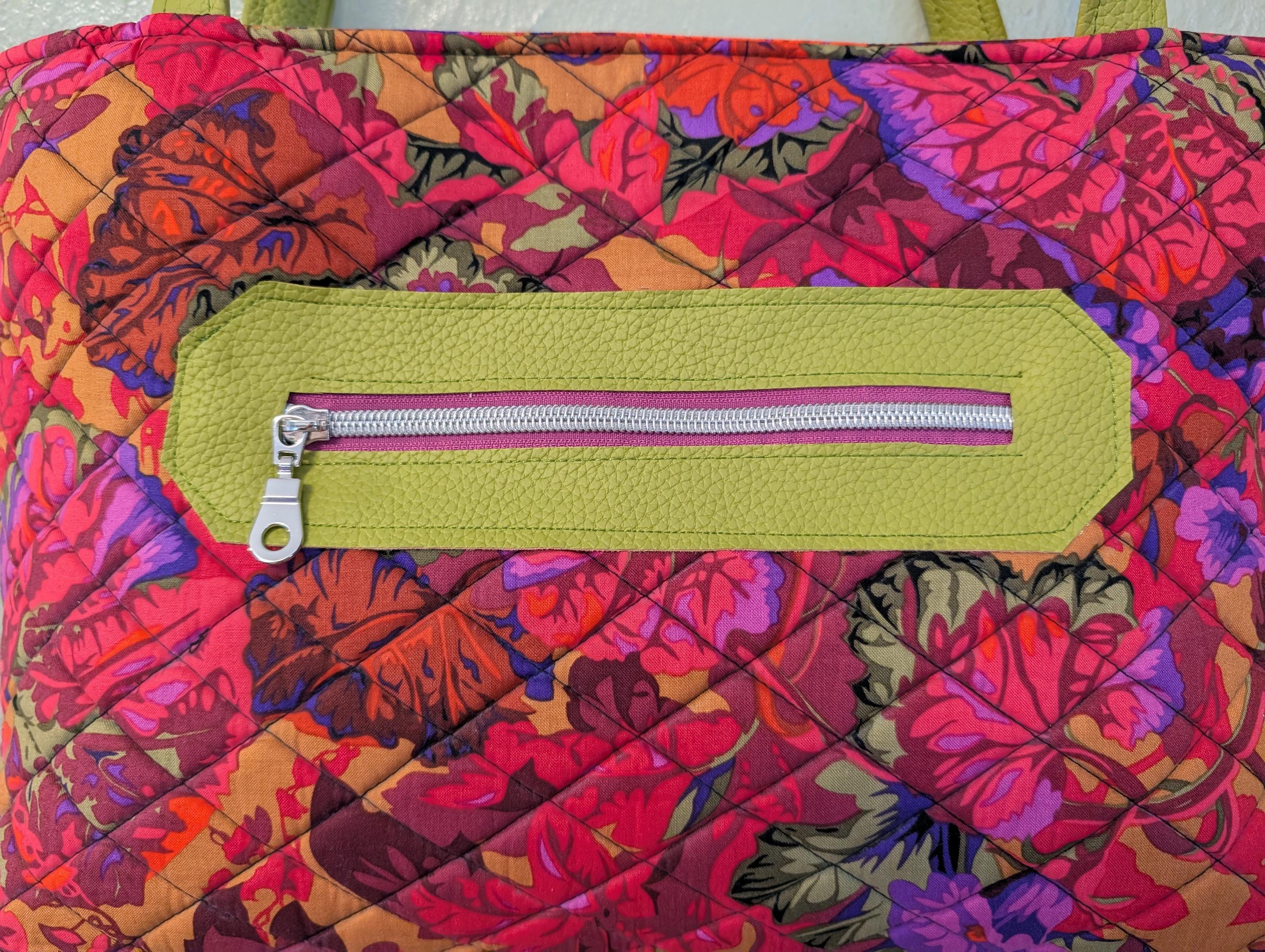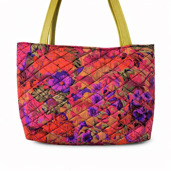 Beautiful diamond quilted fabric in red, pink, rust and purple flowers Kaffe Fassett Grandiose fabric. The handles and accent are olive faux leather