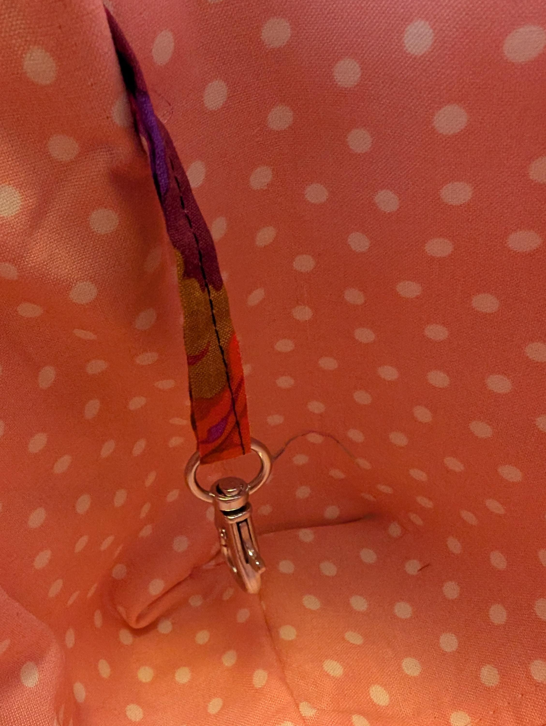 This has a top zipper closure. Inside is pink with white dots lining with a divided slip pocket and a zip pocket. Also has a key leash inside.
