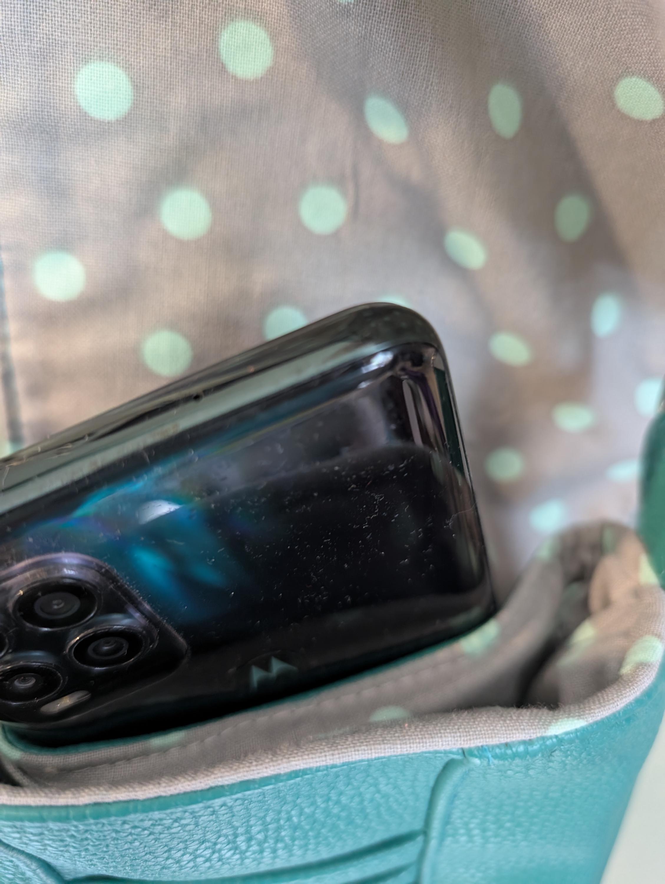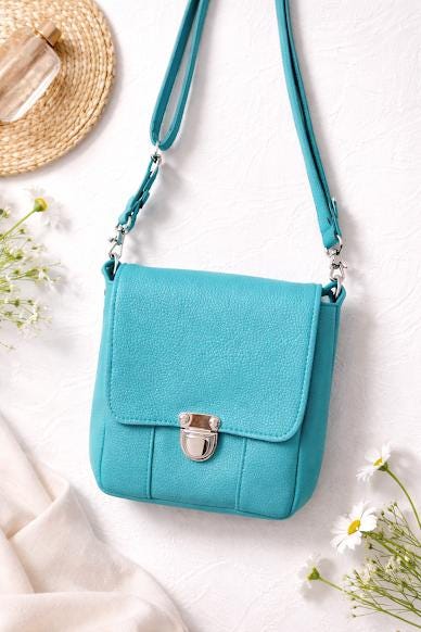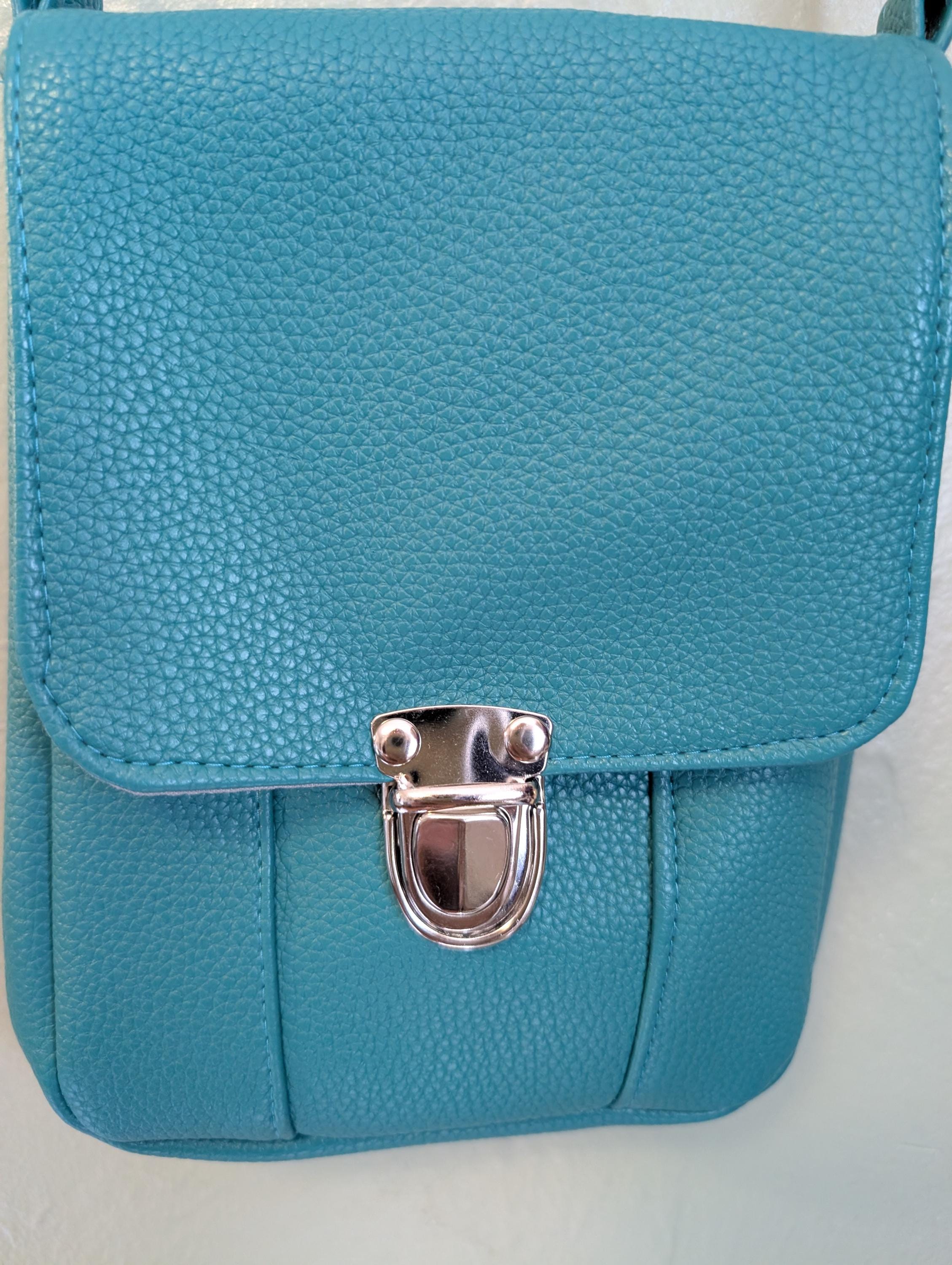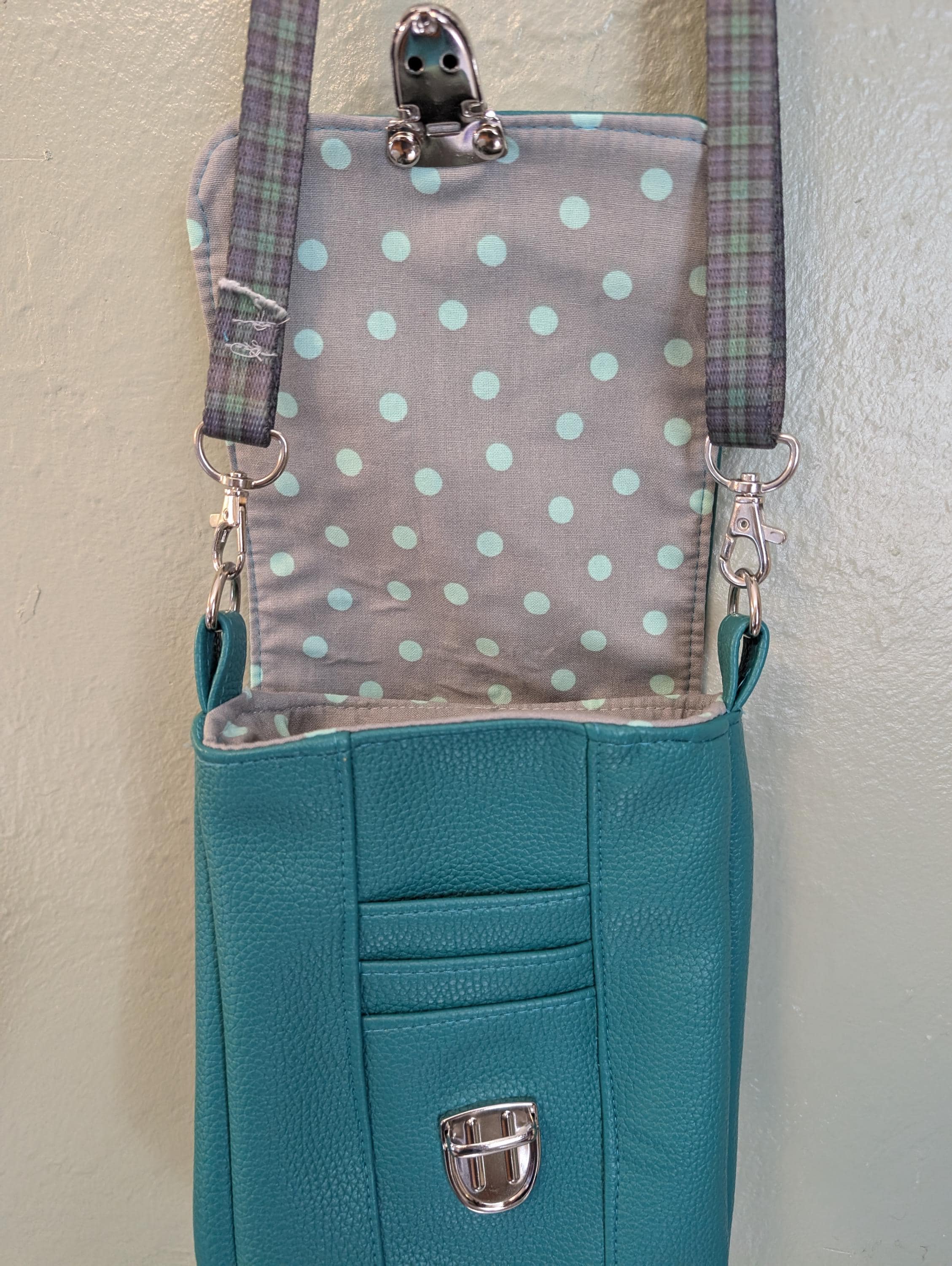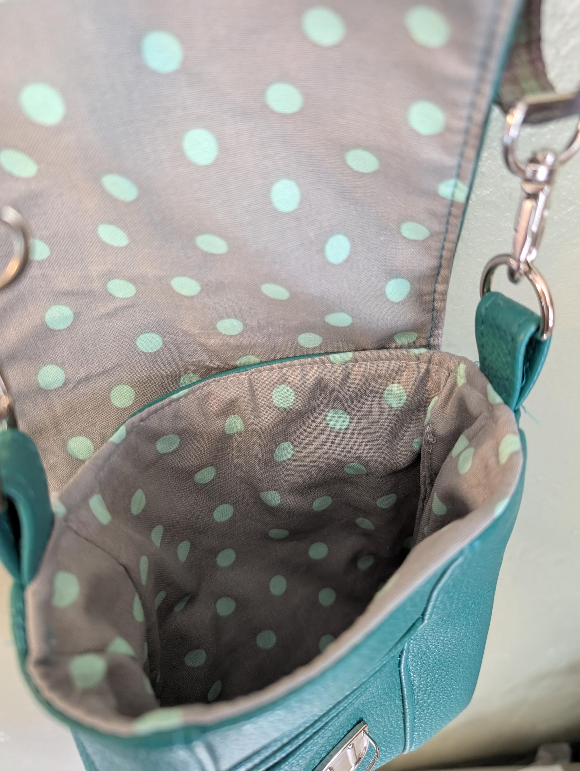 Teal small crossbody bag. Made with soft faux leather outside and gray with teal dots cotton lining. Strap is blue and green plaid webbing.