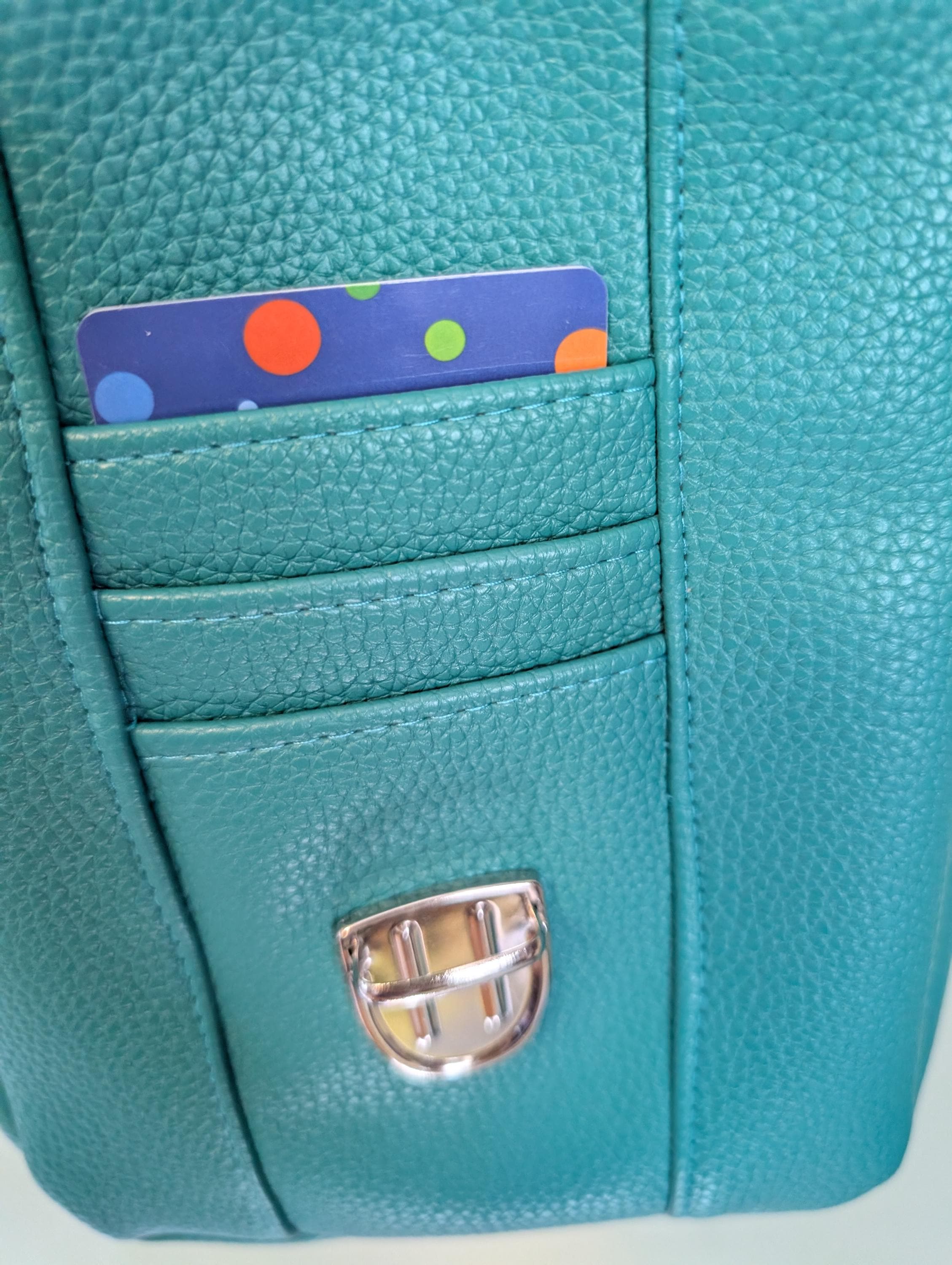 It has a snap lock which opens to 3 card slots, a room inside and a large pocket.