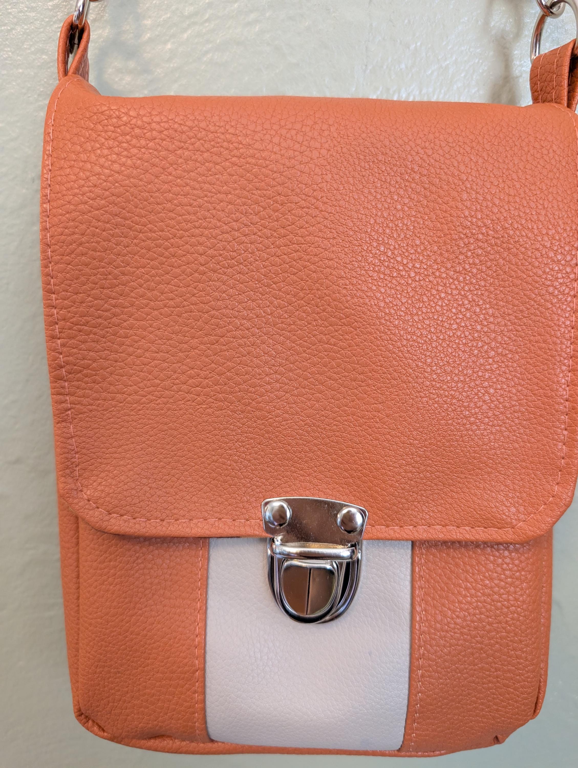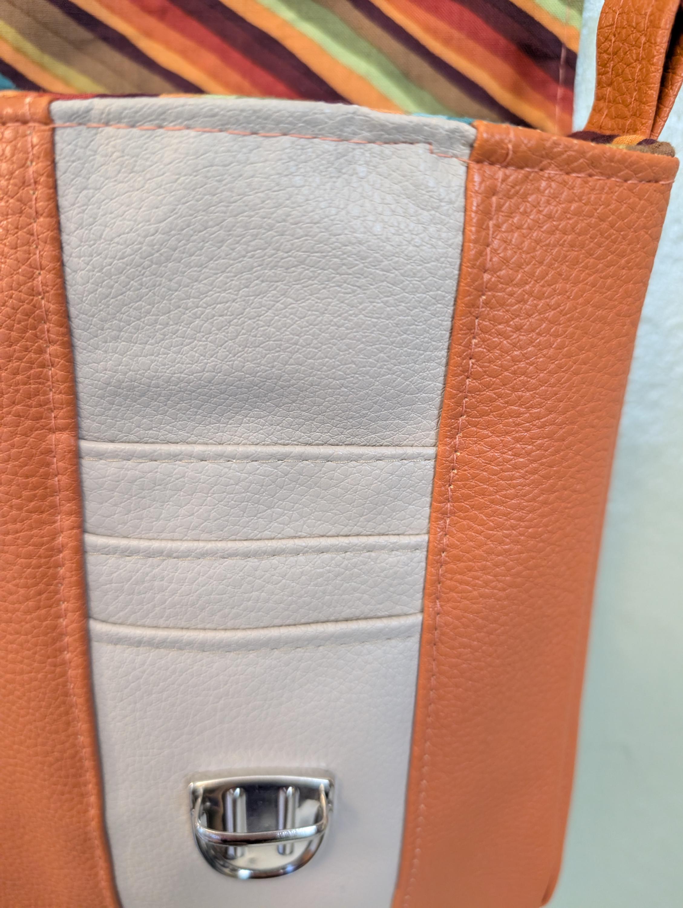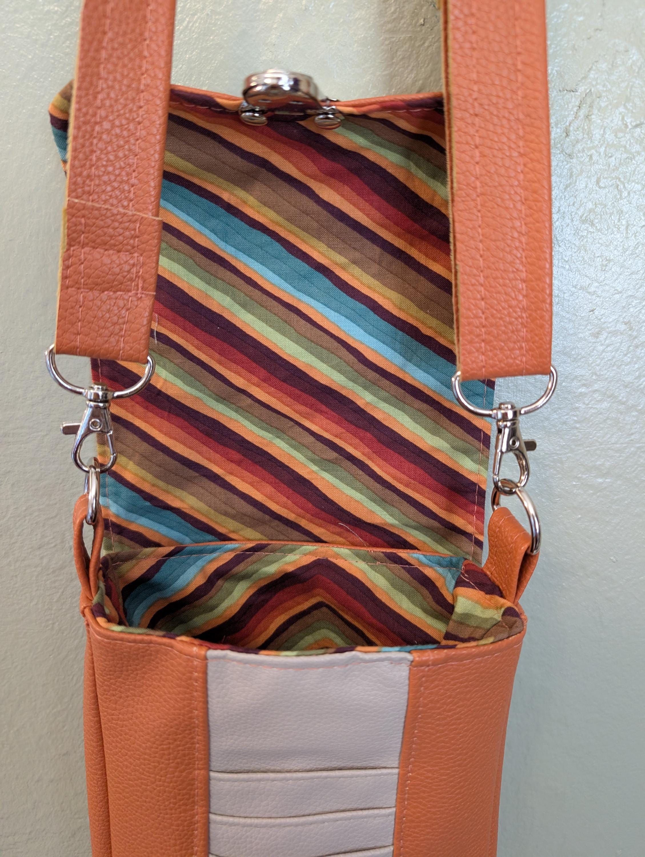 Cinnamon and Taupe small crossbody bag. Made with soft faux leather outside and Kaffe Fassett Chevron Stripe cotton lining. Strap is cinnamon and extends to 47" with connectors.