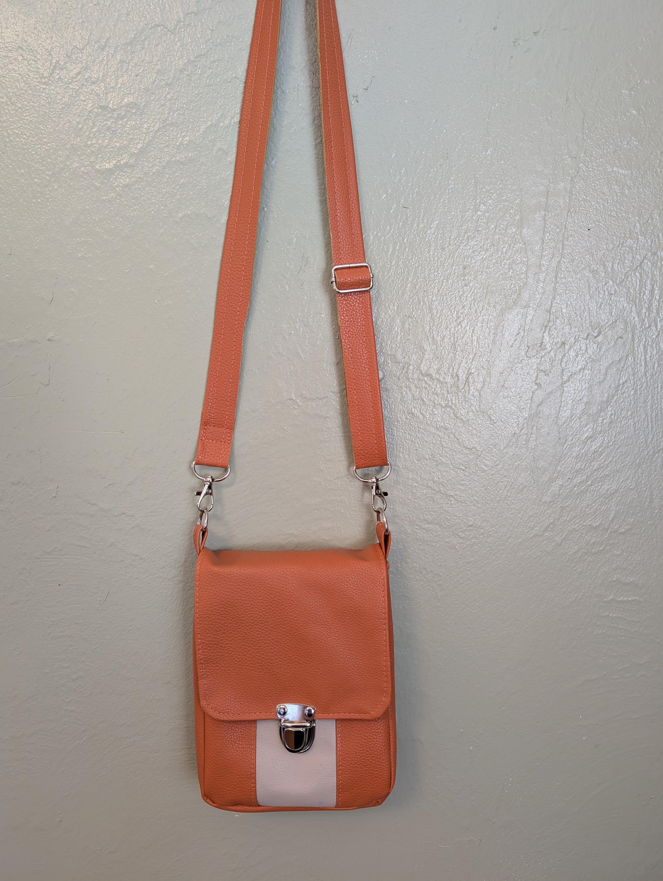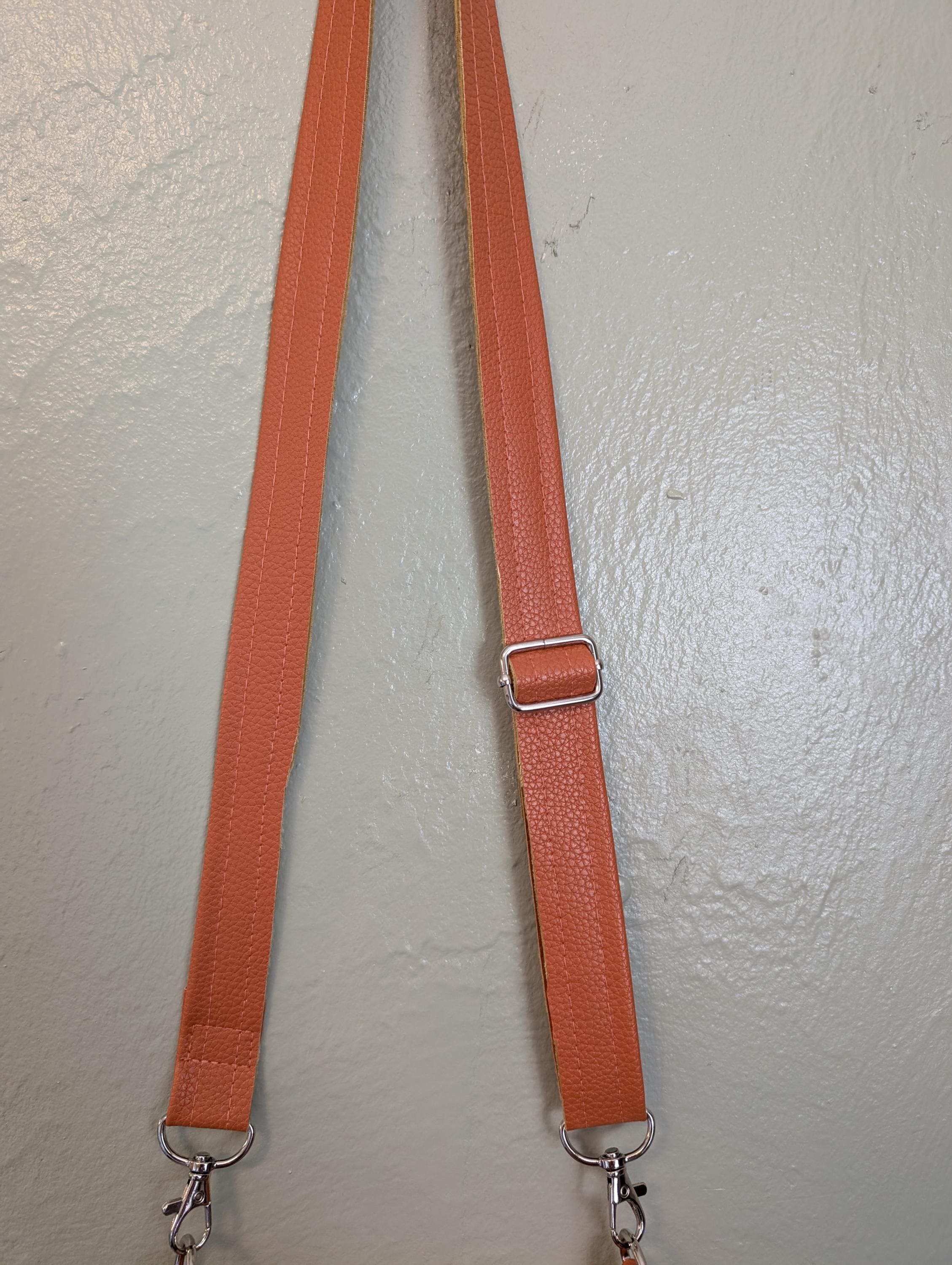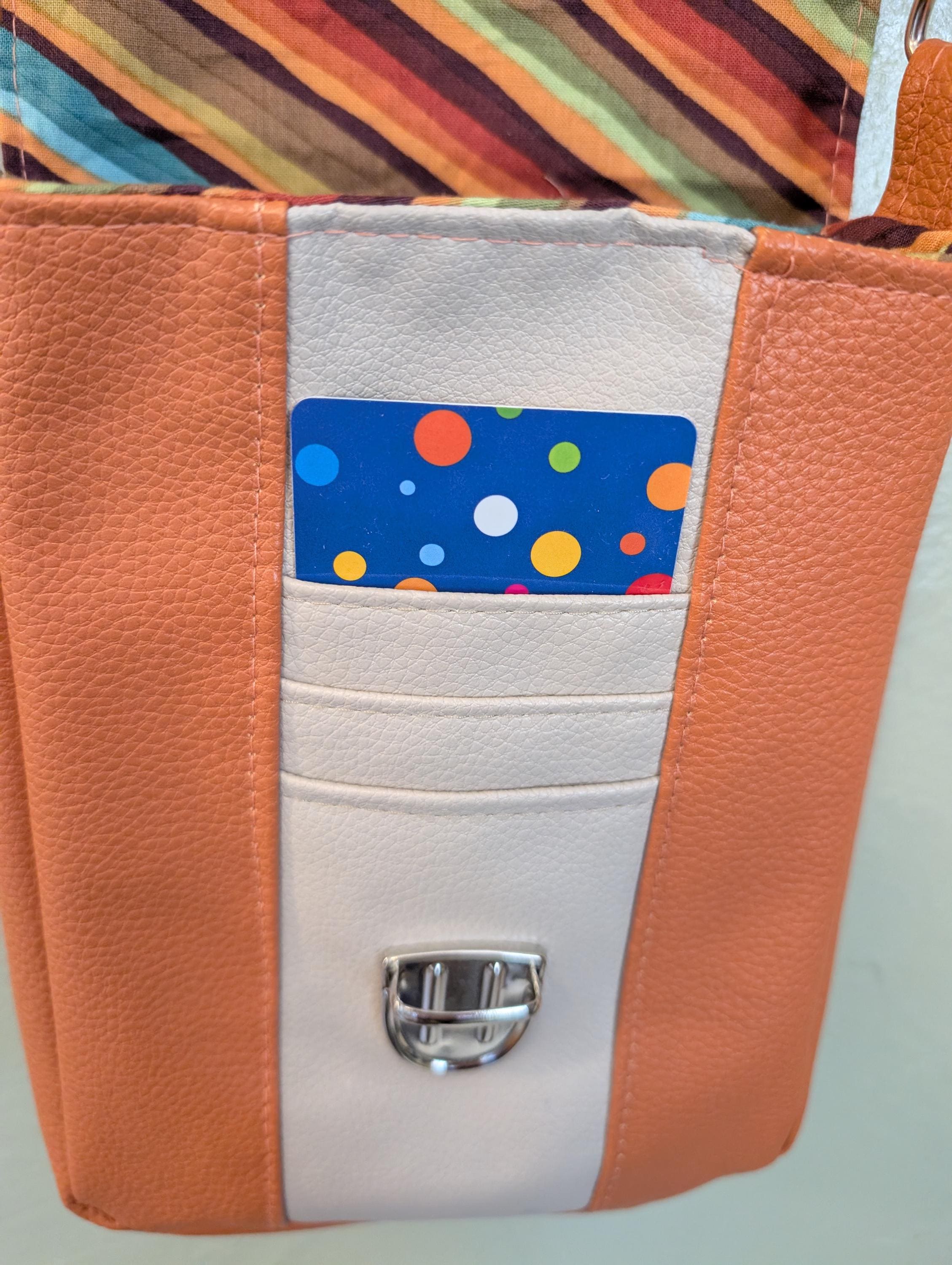 Cinnamon and Taupe small crossbody bag. Made with soft faux leather outside and Kaffe Fassett Chevron Stripe cotton lining. Strap is cinnamon and extends to 47" with connectors.