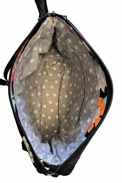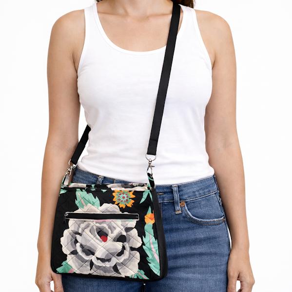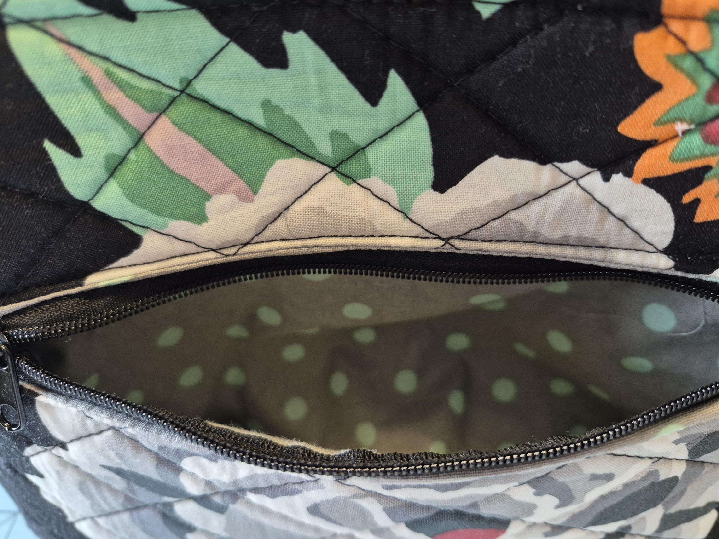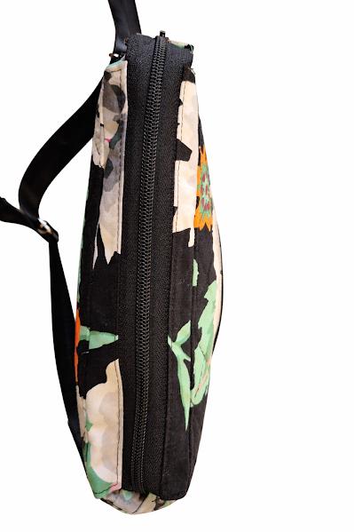 Cute black, white and orange flowers Kaffe Fassett Embroidered Shawl fabric with black faux leather base crossbody bag. This bag has a pocket on front and inside. Zipper closure on top. Strap is blacl webbing and extends to 54".