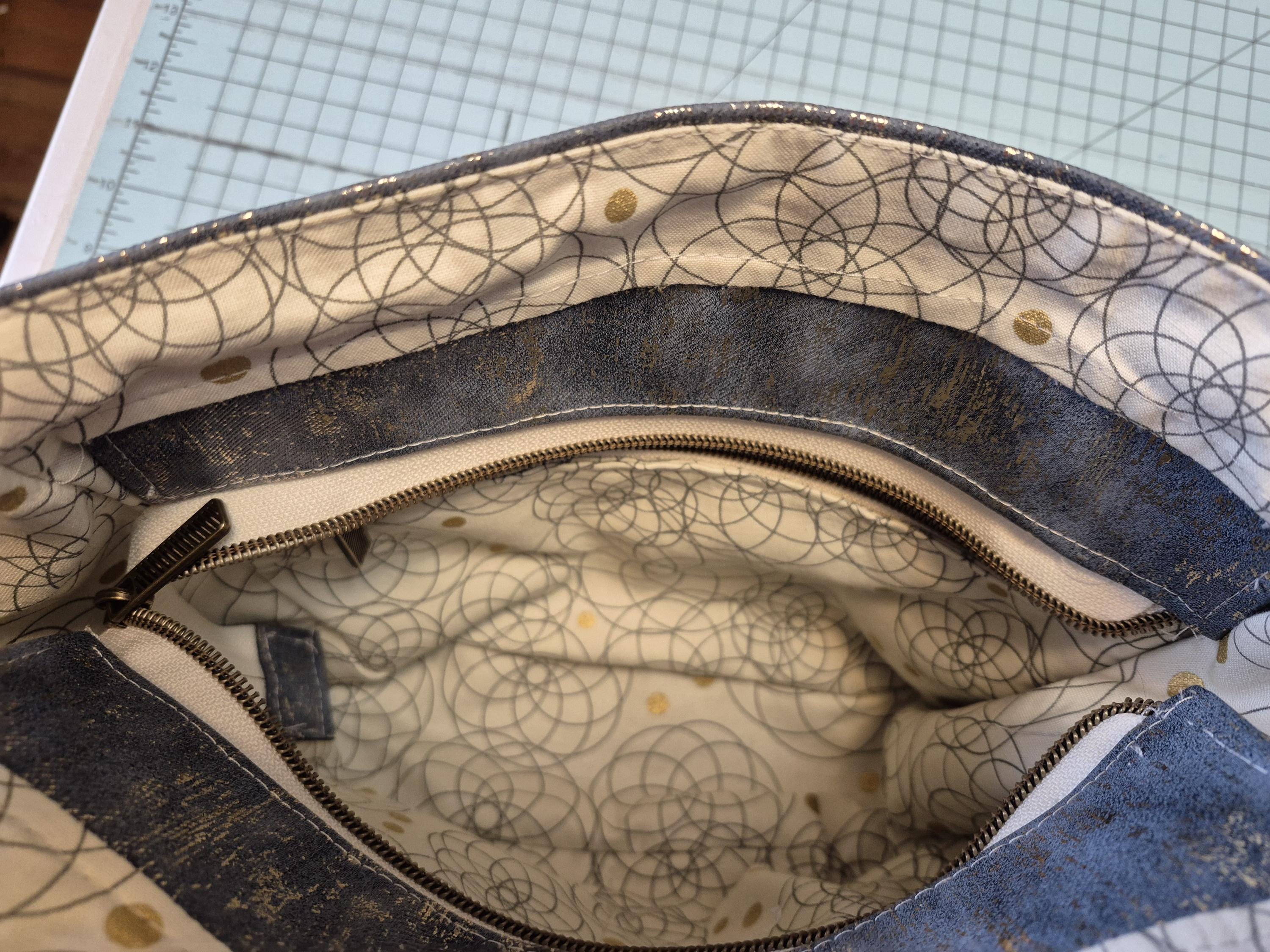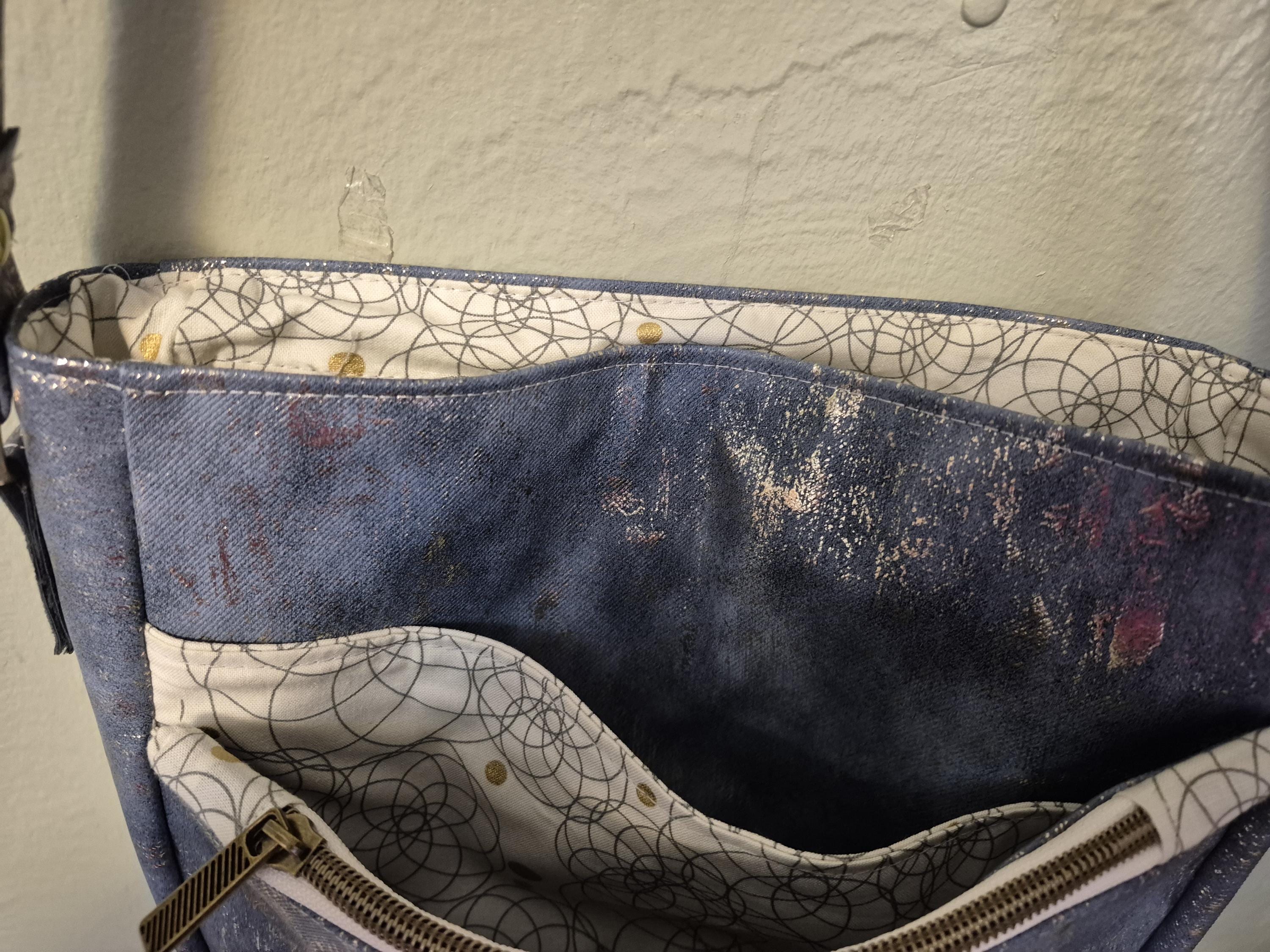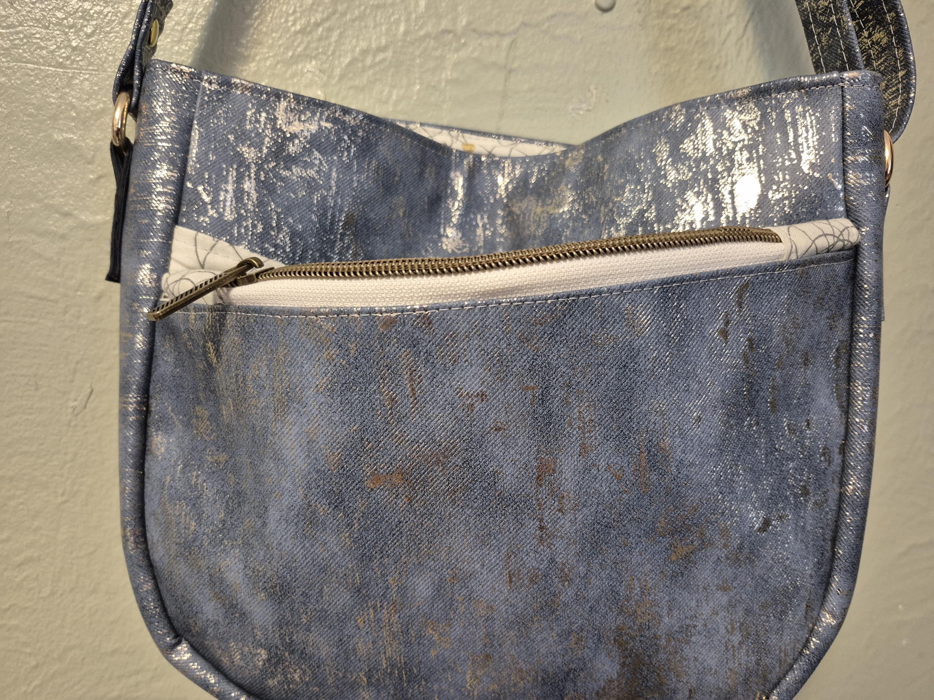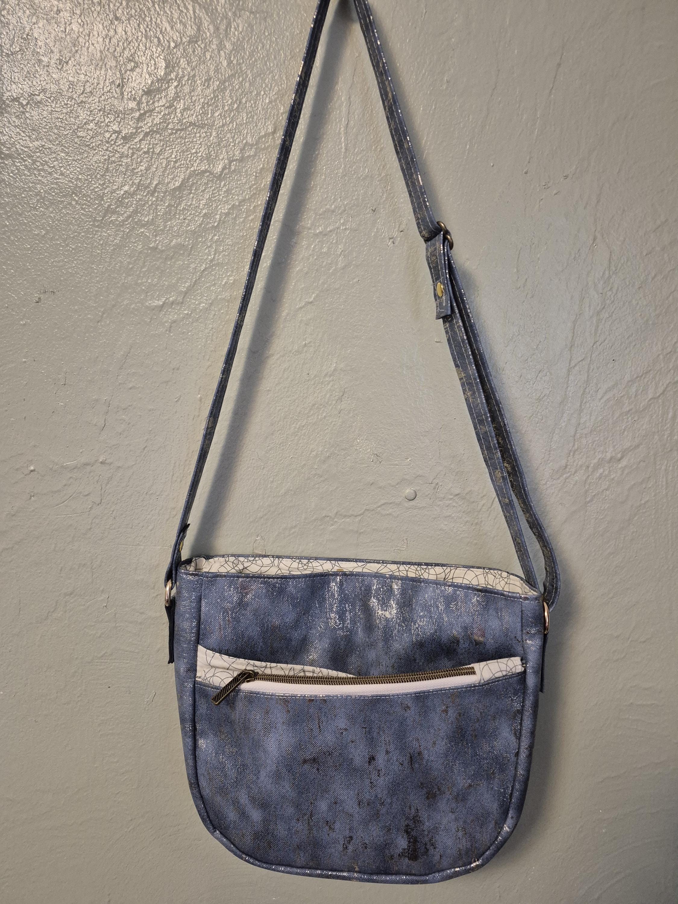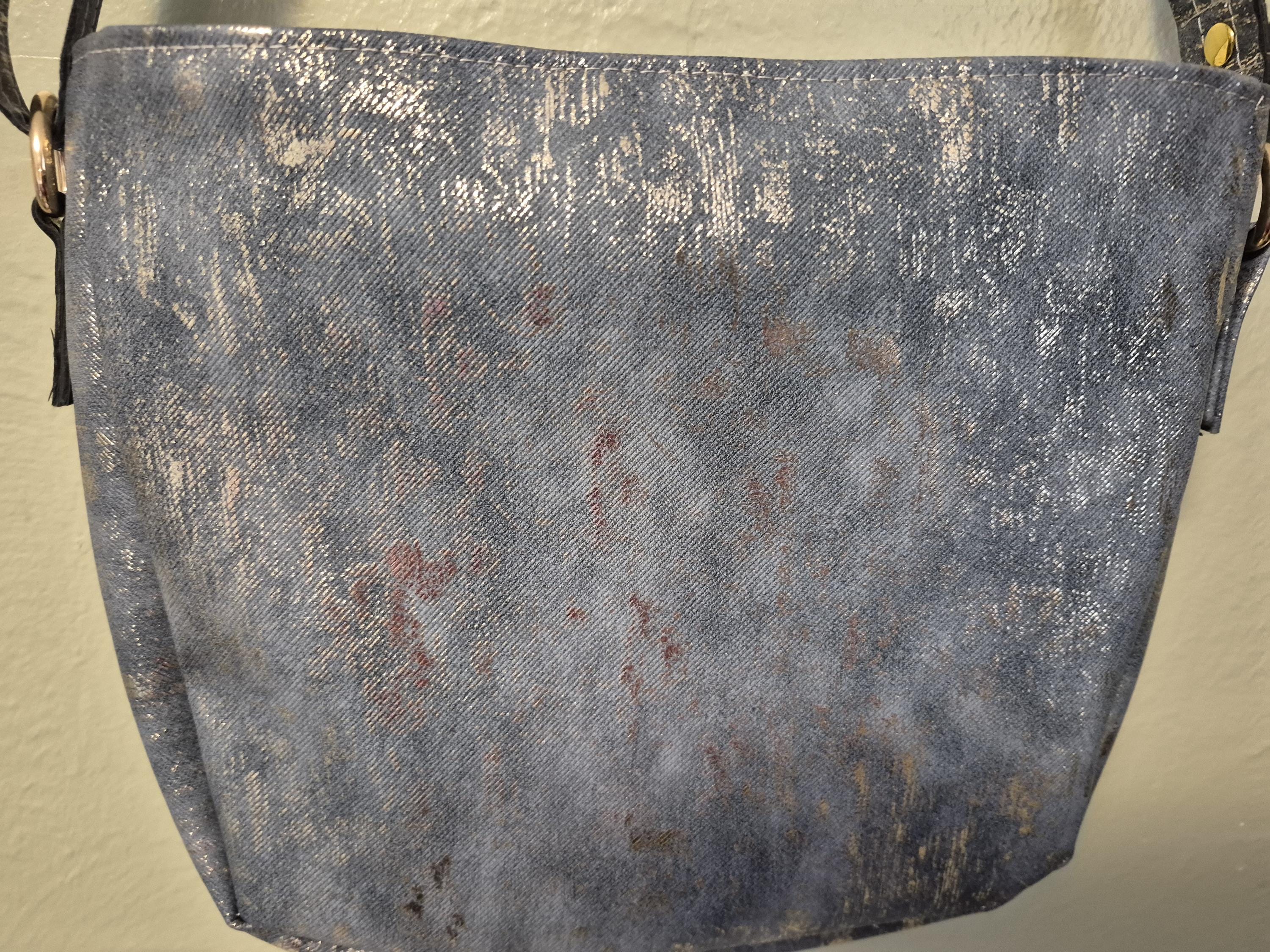 Medium blue denim color faux Leather with gold metallic design. Front has a zip pocket as well as a slip pocket. Zipper top closure