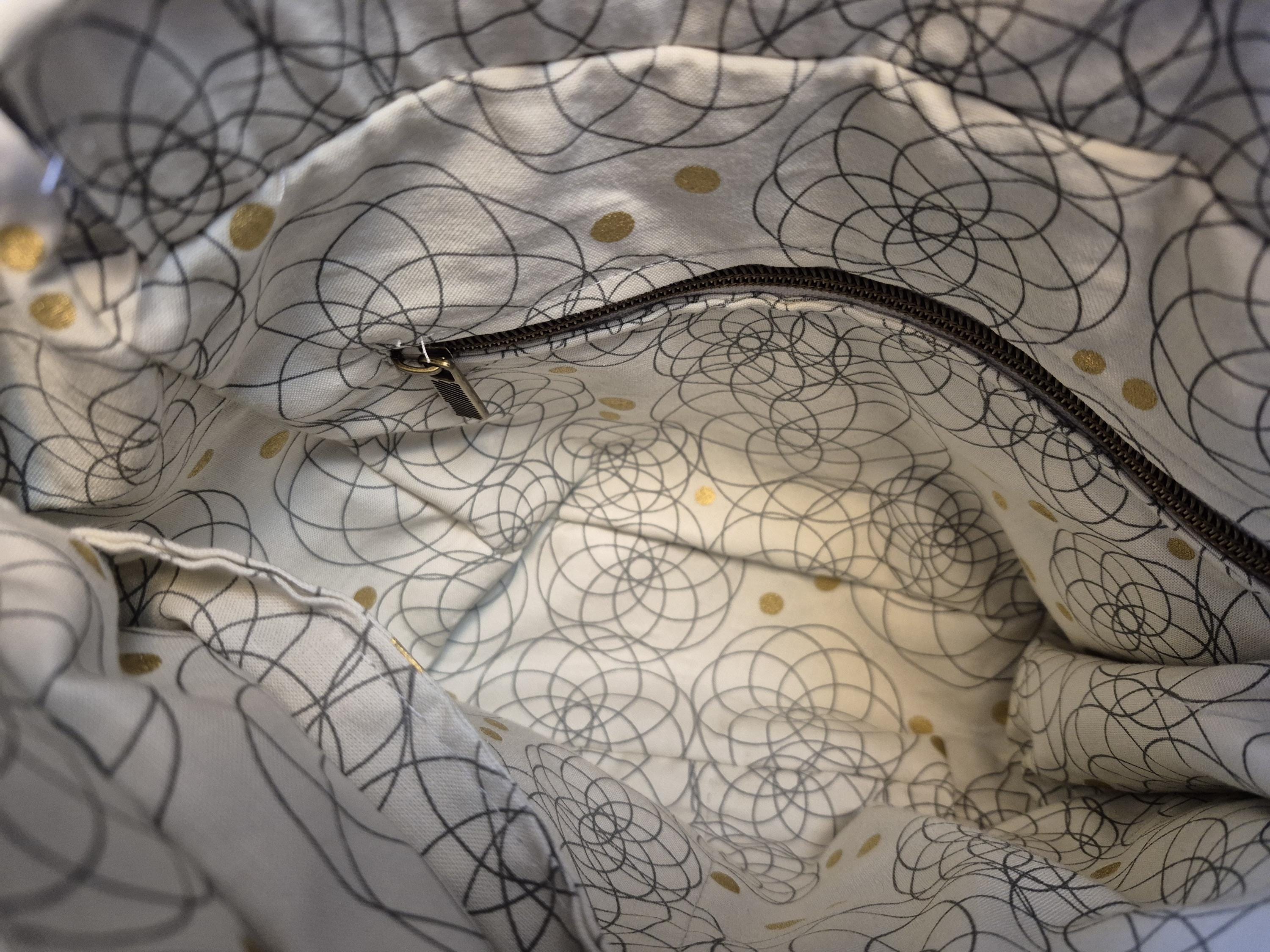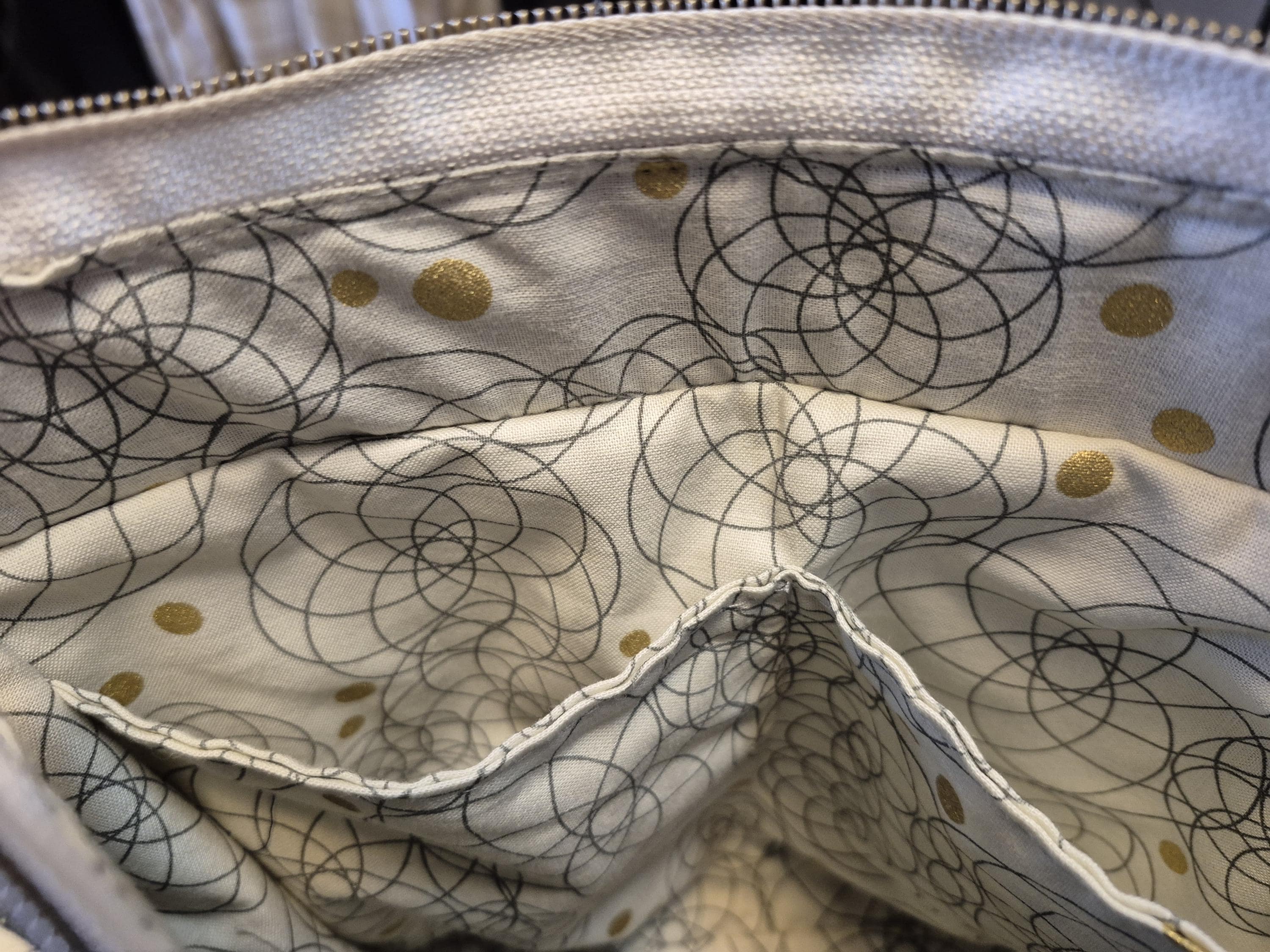 Inside has a divided slip pocket and a zip pocket inside cream fabric with silver and gold design.