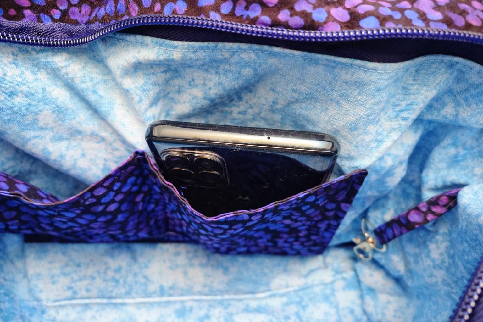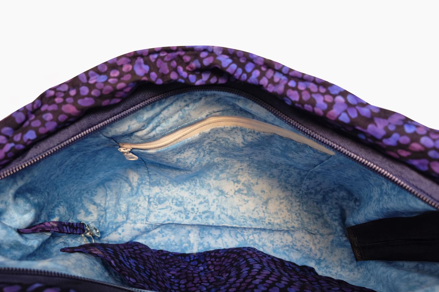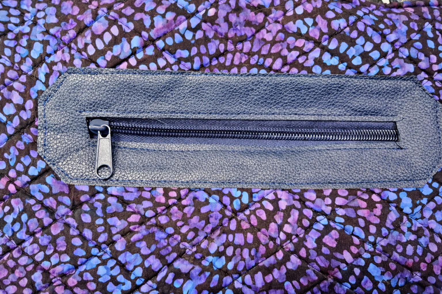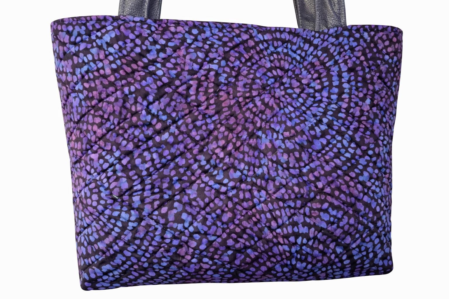 Beautiful diamond quilted fabric in black , navy and purple. The handles and accent are navy faux leather