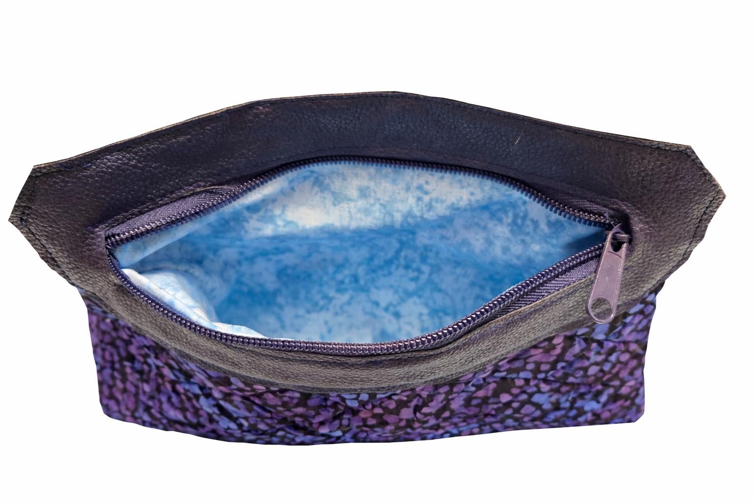 This has a top zipper closure. Inside is blue lining with a divided slip pocket and a zip pocket. Also has a key leash inside.