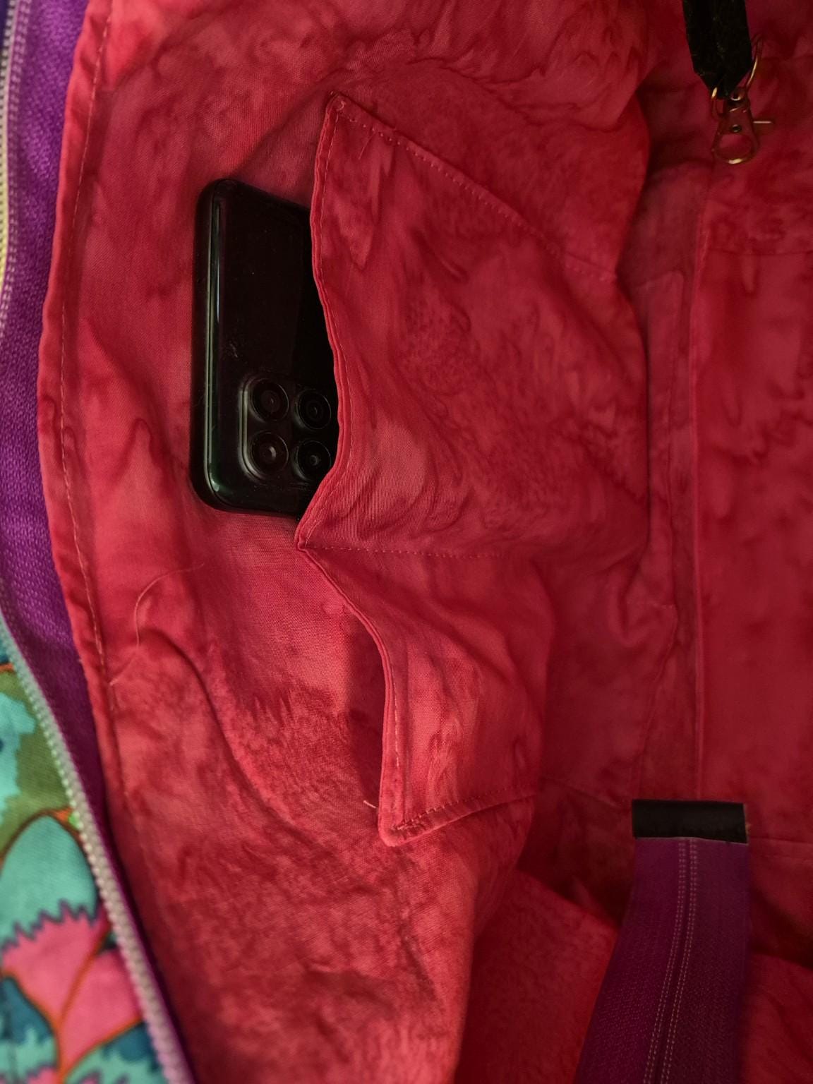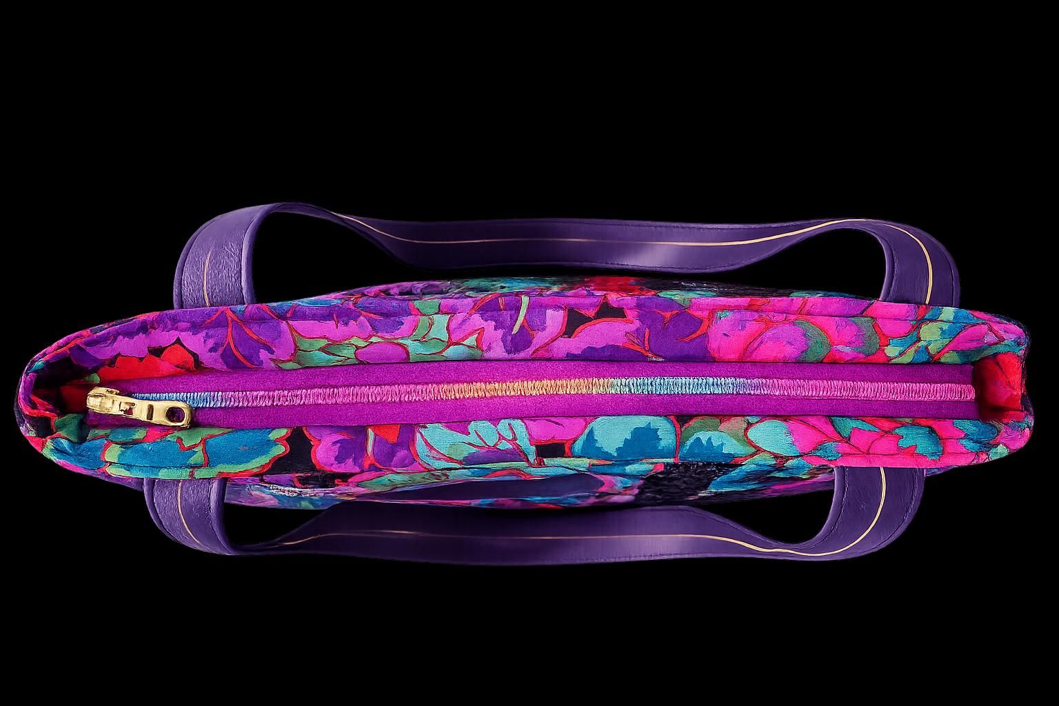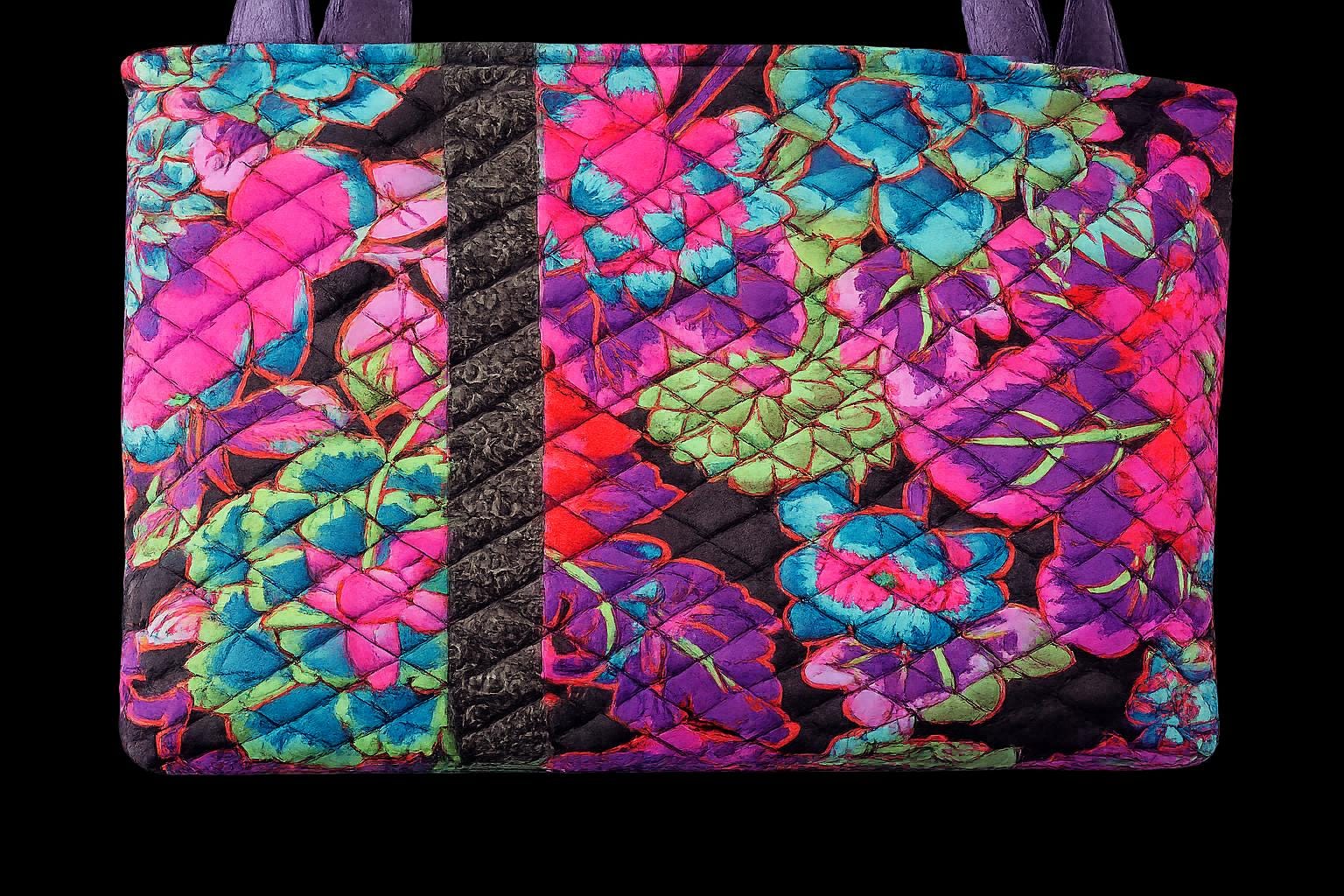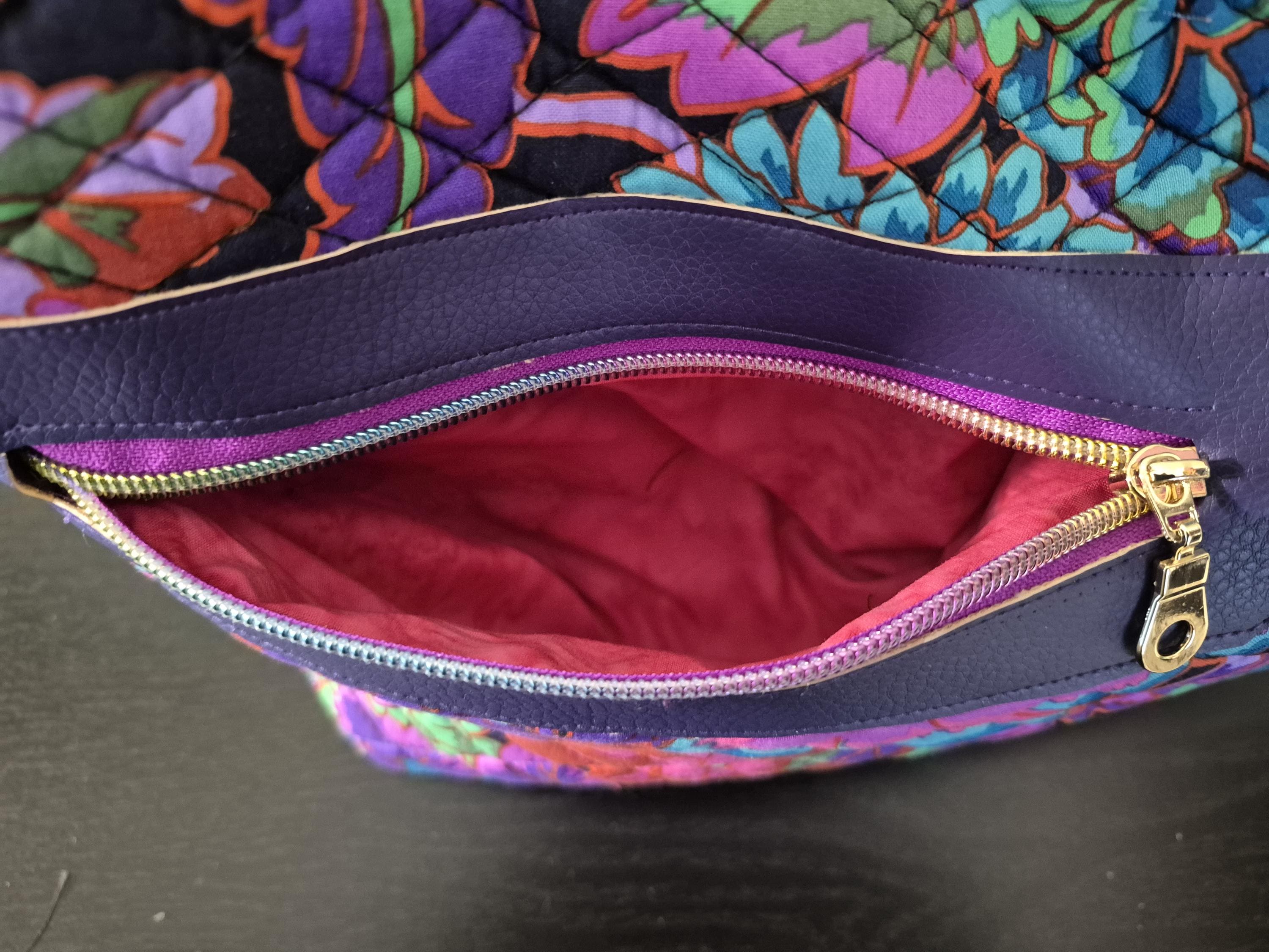 Beautiful quilted Kaffe Fassett Cloisene fabric in black, purple, pink, and green paisley with black batik accent piece. The handles and accent are purple faux leather