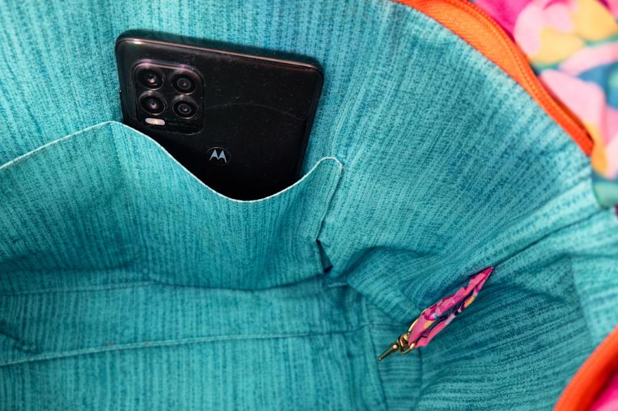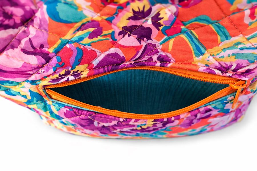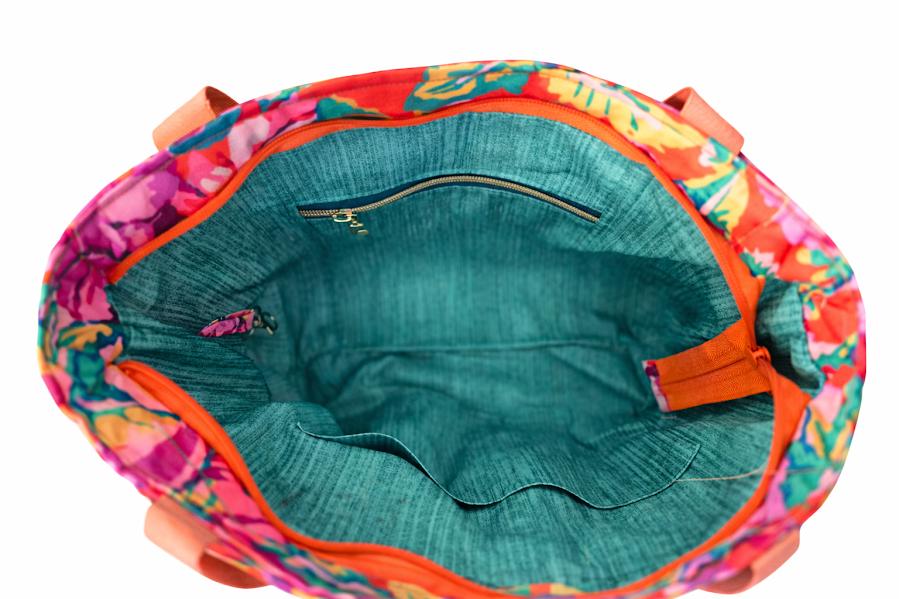 The bag has a top zipper closure and spacious interior lined in teal fabric complete with: