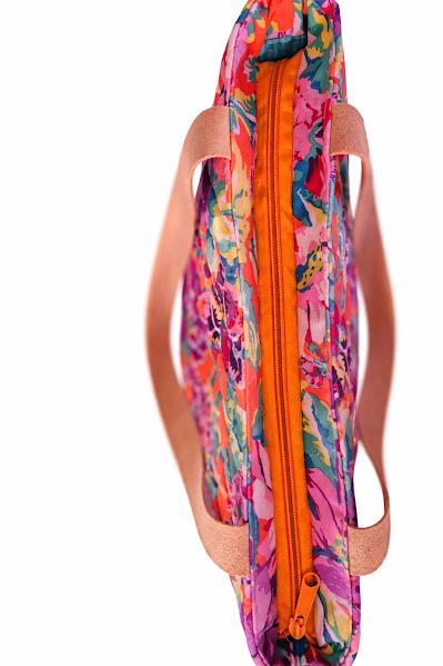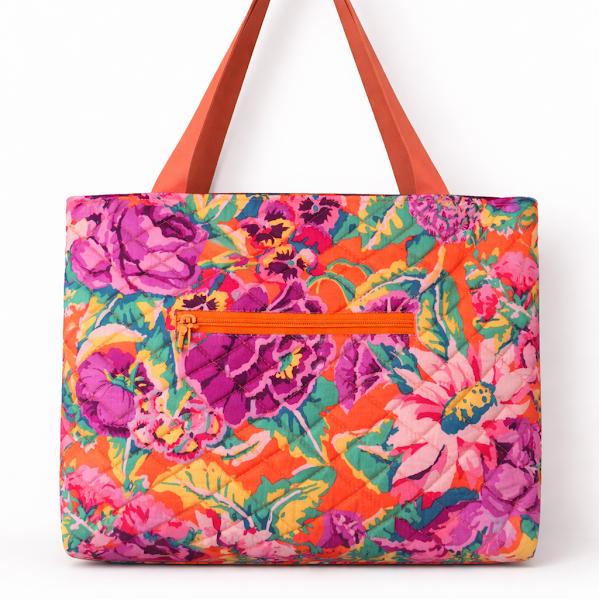 This eye-catching tote features genuine leather handles and a vibrant floral design that's both bold and timeless.