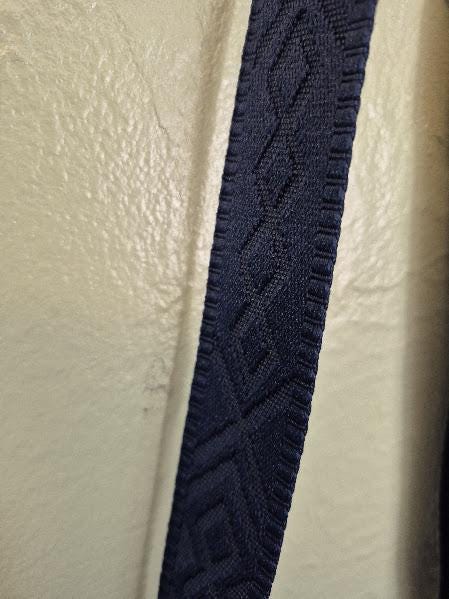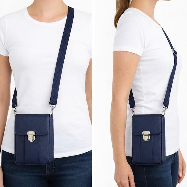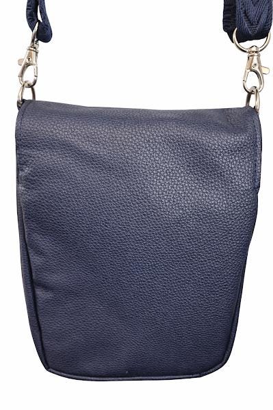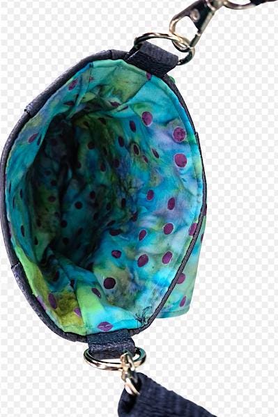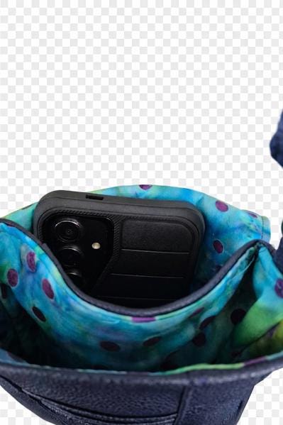 The exterior is made with soft faux leather in beautiful navy blue, while the inside is lined with teal and purple batik cotton for a fun pop of color. The navy adjustable strap extends to 55" including connectors, making it easy to wear comfortably as a crossbody.